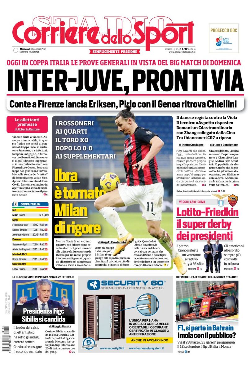L'edizione di oggi de Il Corriere dello Sport apre in prima pagina con le gare degli ottavi di Coppa Italia. Oltre al Napoli altre due grandi scendono in campo stasera: "Inter-Juve, pronti via. Le prove generali in vista del big match di domenica". Al centro la qualificazione ai quarti del Milan: "Ibra è tornato, Milan di rigore".