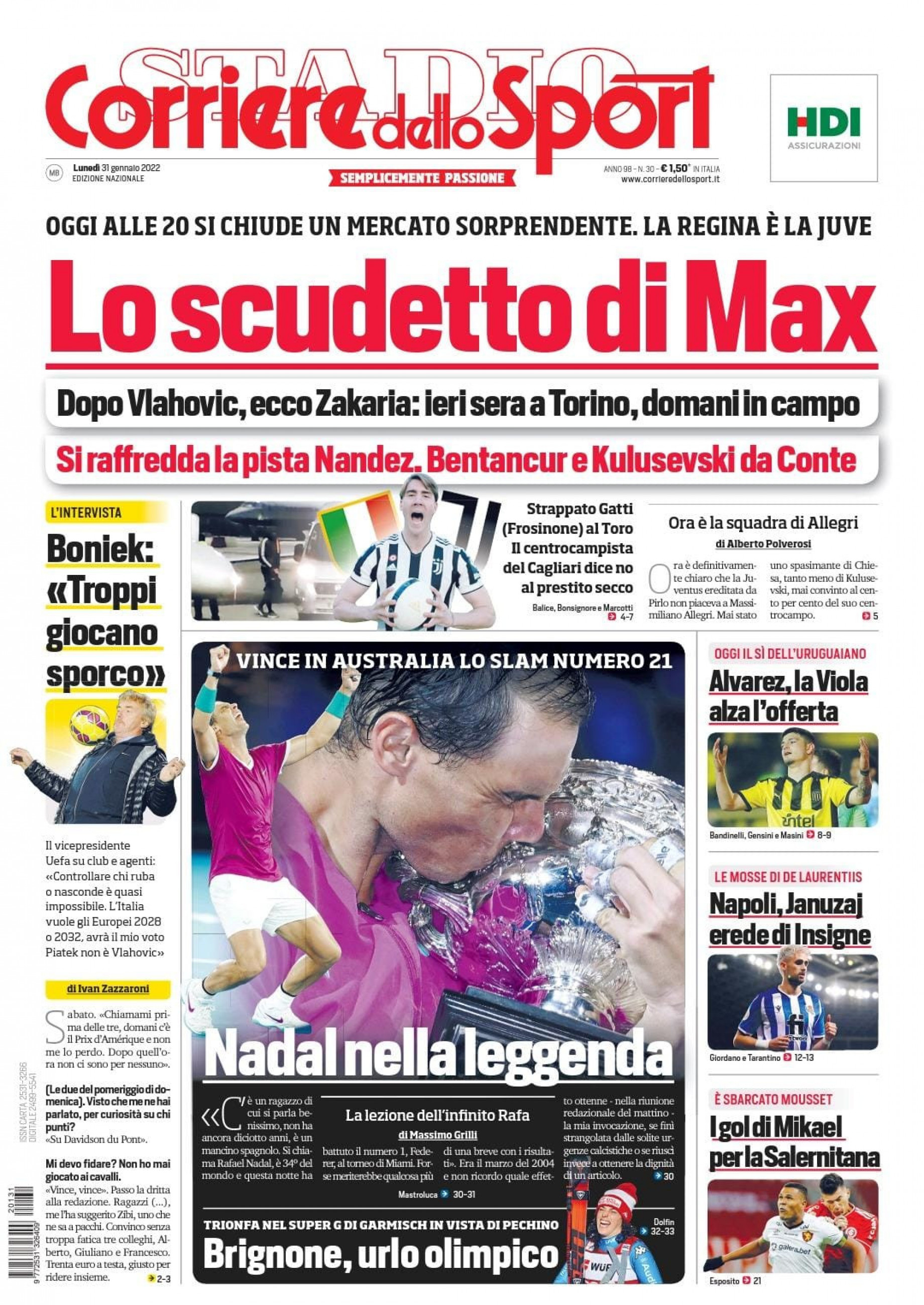 Januzaj erede di Insigne, titola di in un box in prima pagina l'edizione nazionale del Corriere dello Sport in merito alle mosse di ADL. L'apertura è per la Juventus che dopo Vlahovic prende Zakaria: "Lo scudetto di Max" con la Juventus regina del mercato.