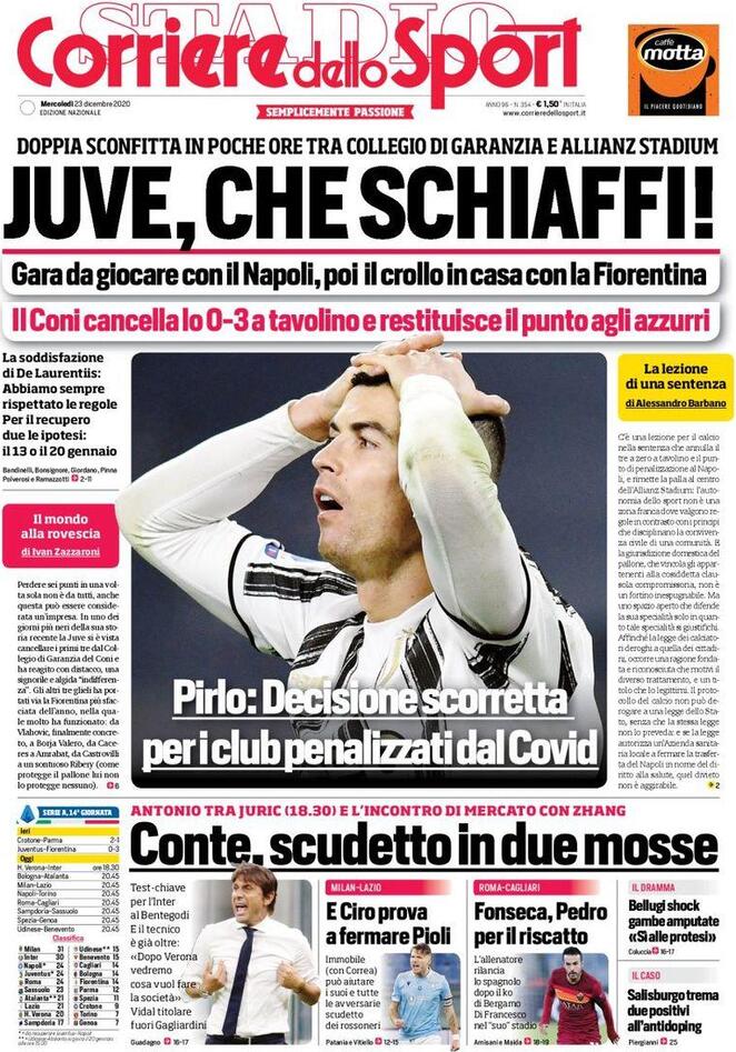 Nell'edizione di oggi il Corriere dello Sport apre in prima pagina con la pessima giornata della Juve sconfitta dal Collegio di Garanzia del Coni e sul campo dalla Fiorentina: "Juve, che schiaffi! Crollo in casa con la Fiorentina. Il Coni cancella lo 0-3 a tavolino e restituisce il punto agli azzurri. Per il recupero due le ipotesi: il 13 o il 20 gennaio".