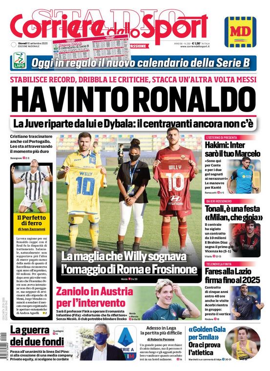 Il Corriere dello Sport oggi in edicola titola in prima pagina: "Ha vinto Ronaldo". La Juventus riparte da Cristiano Ronaldo e Paulo Dybala: il centravanti ancora non c'è. Il campione portoghese stabilisce record, dribbla le critiche e stacca un'altra volta Leo Messi: Cristiano è un trascinatore, anche in nazionale, mentre Leo sta attraversando il momento più duro.