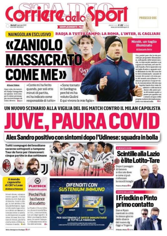 L'edizione di oggi de Il Corriere dello Sport apre in prima pagina con la Juventus ed il contagio Covid di Alex squadra: paura e squadre che va in bolla. Spazio anche alla Lazio, ed il clima teso in casa biancoceleste: il mercato, infatti, avrebbe creato una lite tra Lotito e Tare, in mezzo come poter migliorare la squadra di Inzaghi.