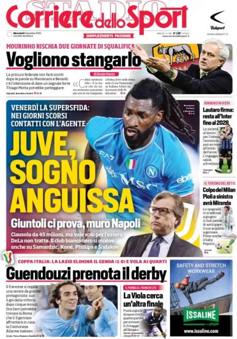 Nell'edizione odierna, il Corriere dello Sport apre con un'indiscrezione di mercato: "Juve, sogno Anguissa. Giuntoli ci prova, muro Napoli. Venerdì la supersfida: nei giorni scorsi contatti con l'agente". In taglio basso spazio alla Lazio che batte il Genoa e si qualifica ai quarti di finale di Coppa Italia: "Guendouzi prenota il derby". Di spalla il mercato delle milanesi: "Lautaro firma: resta all'Inter fino al 2028". "Colpo del Milan: Pioli a sinistra avrà Miranda".