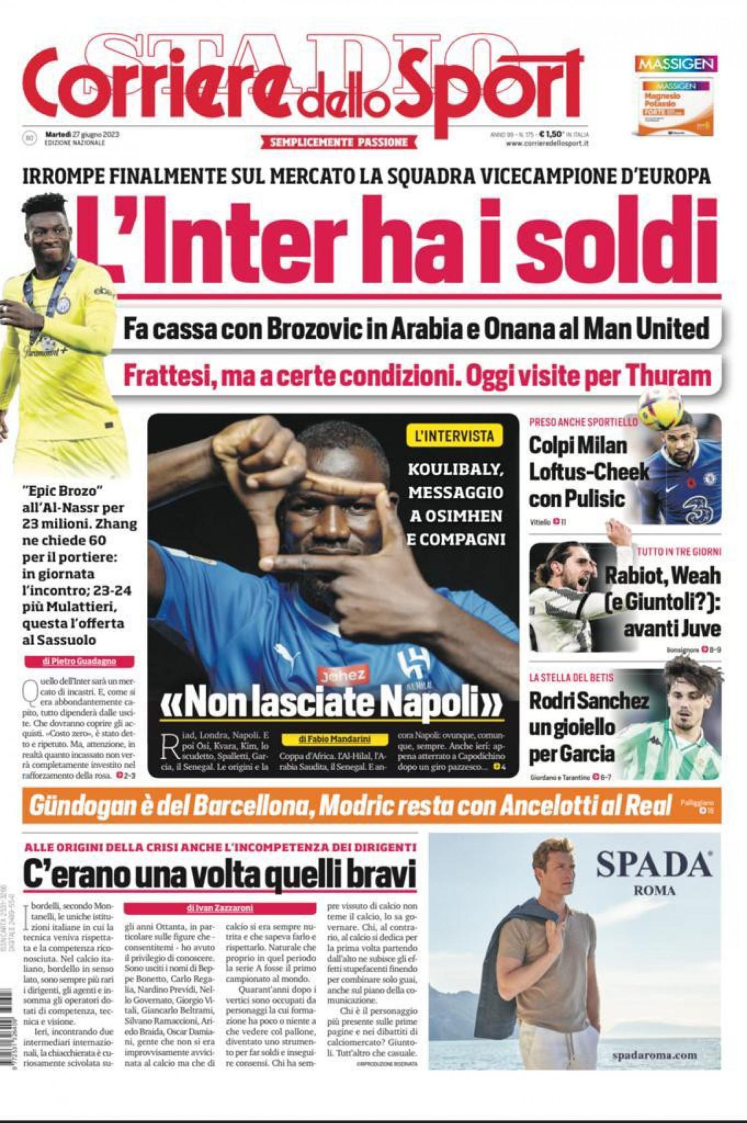“L’Inter ha i soldi”. Titola così in taglio alto l’edizione odierna del Corriere dello Sport. “Fa cassa con Brozovic in Arabia e Onana al Man United. Frattesi, ma a certe condizioni. Oggi visite per Thuram. "Epic Brozo" all'Al-Nassr per 23 milioni. Zhang ne chiede 60 per il portiere: in giornata l'incontro; 23-24 milioni più Mulattieri, questa l'offerta al Sassuolo”. Spazio anche all’intervista a Kalidou Koulibaly, ex difensore del Napoli: "Koulibaly, messaggio a Osimhen e compagni: ‘Non lasciate Napoli’”. Mercato anche del Milan in prima pagina: “Colpi Milan, Loftus-Cheek con Pulisic. Preso anche Sportiello”. Sulla Juve si legge: “Rabiot, Weah (e Giuntoli?): avanti Juve”.