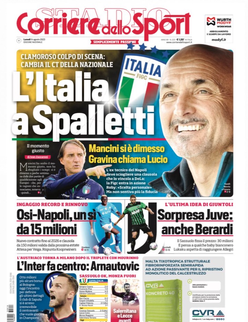 PRIMA PAGINA - Cds: "L'Italia a Spalletti. Osi-Napoli, sì da 15mln!"