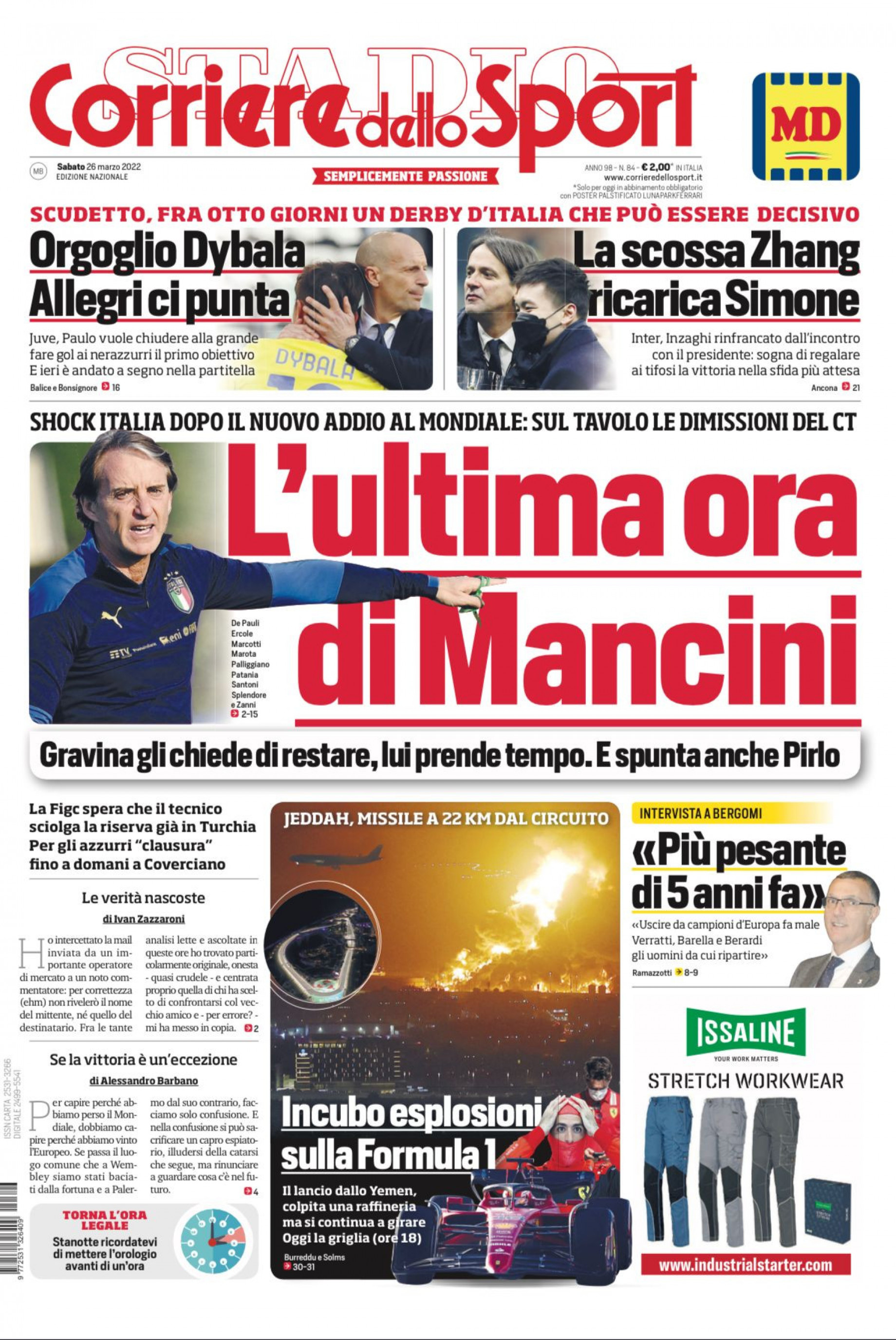 Nell'edizione di oggi il Corriere dello Sport, apre in prima pagina col futuro incerto del ct della Nazionale: "L'ultima ora di Mancini. Gravina gli chiede di restare, lui prende tempo. E Spunta anche Pirlo". In taglio alto spazio al derby d'Italia Juve-Inter, in programma tra 8 giorni: "Orgoglio Dybala, Allegri ci punta. La scossa Zhang ricarica Simone".