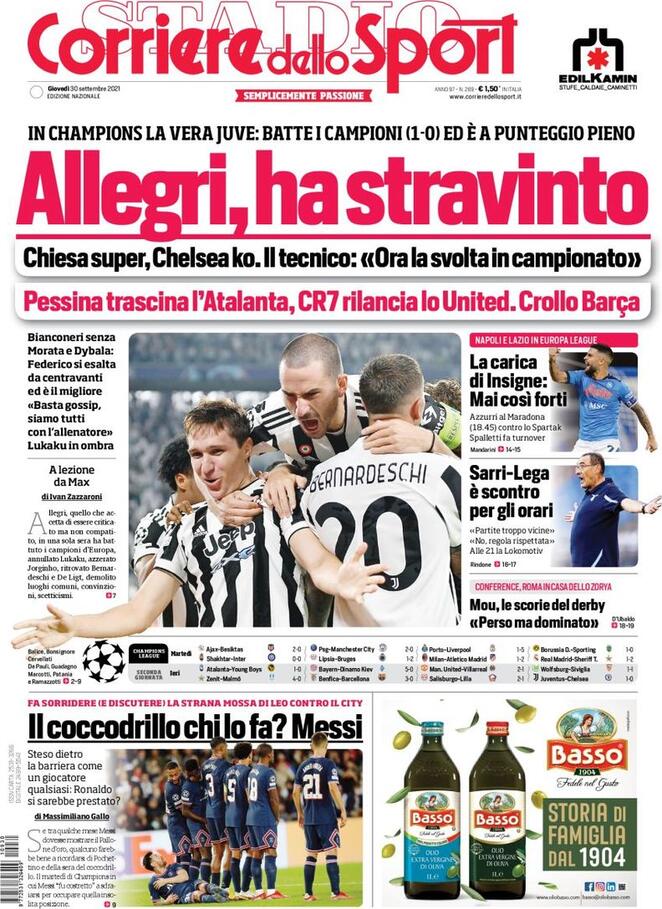 Il Corriere dello Sport, nell'edizione di oggi, riporta le dichiarazioni del capitano del Napoli alla vigilia della sfida di Europa League: "La carica di Insigne: Mai così forti. Azzurri al Maradona (18.45) contro lo Spartak. Spalletti fa turnover". Apertura alla vittoria in Champions League della Juventus contro il Chelsea: "Allegri ha stravinto. Chiesa super, Chelsea ko. Il tecnico: 'Ora la svolta in campionato'". Al centro pagina spazio agli altri risultati di ieri in Champions: "Pessina trascina l'Atalanta, CR7 trascina lo United. Crollo Barça".