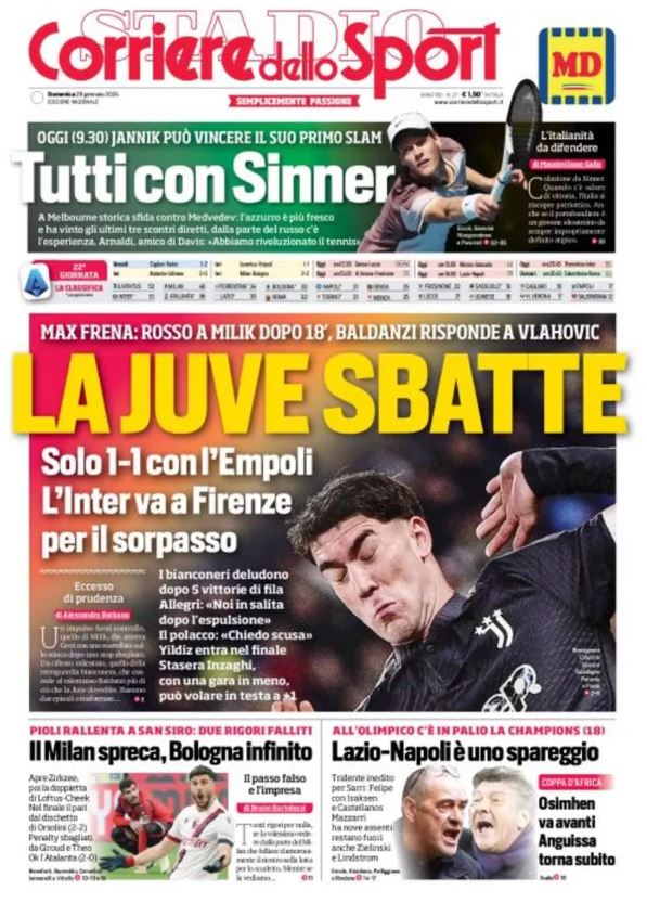 Nell'edizione odierna, Il Corriere dello Sport dedica spazio in prima pagina alla sfida tra Lazio e Napoli: "Lazio-Napoli è uno spareggio", anticipando l'esclusione di Zielinski. In taglio basso, spazio alla Coppa d'Africa: "Osimhen va avanti, Anguissa torna subito". Al centro, spazio alla Juventus: "La Juve sbatte. Solo 1-1 con l'Empoli".