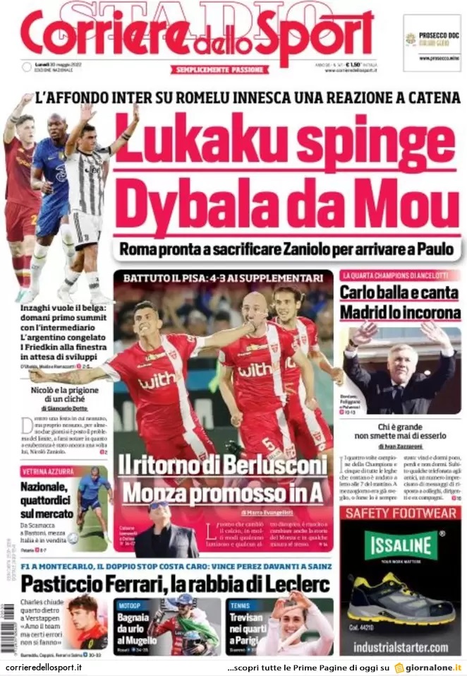 Nell'edizione di oggi il Corriere dello Sport apre con un'indiscrezione di mercato: "Lukaku spinge Dybala da Mou. Roma pronta a sacrificare Zaniolo per arrivare a Paulo". A centro pagina spazio alla storica promozione del Monza in Serie A: "Il ritorno di Berlusconi: Monza promosso in A". Di spalla i festeggiamenti di Carlo Ancelotti per la conquista della Champions League col Real: "Carlo balla e canta, Madrid lo incorona".