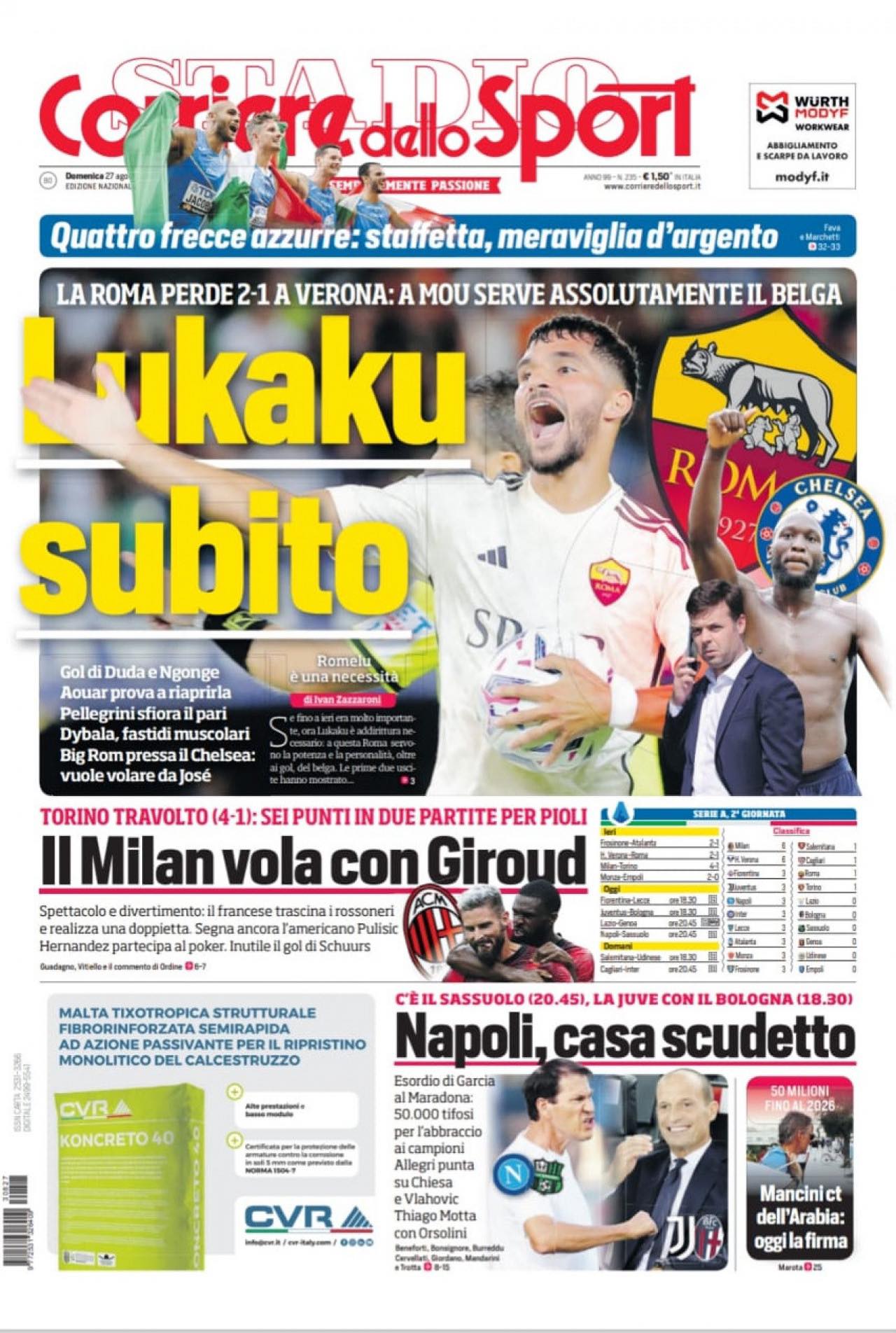 "Lukaku subito", titola il Corriere dello Sport per raccontare della trattativa avviata per l'approdo di Lukaku a Roma, ma anche della necessità della squadra di Mourinho, sconfitta a Verona. In taglio basso "Il Milan vola con Girud", travolgendo il Torino mentre "Napoli, casa Scudetto", per la prima interna dei campioni