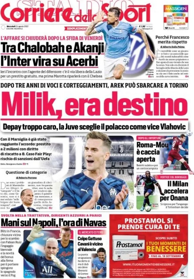 "Milik, era destino", titola il Corriere dello Sport che racconta che Depay è troppo caro e così la Juve sceglie il polacco come vice-Vlahovic, vicino già 3 anni fa. 2mln di prestito con diritto di riscatto a 8mln. In taglio basso "Mani sul Napoli, è l'ora di Navas" con i dirigenti azzurri a Parigi: un blitz per chiudere lo scambio con Fabian. Ingaggio biennale per il portiere e la novità del bonus alla firma.
