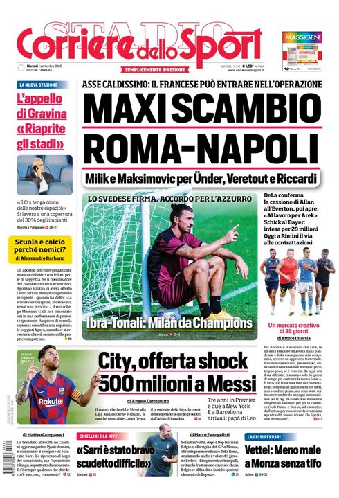 PRIMA PAGINA - CdS: "Maxi scambio, Maksimovic e Milik alla Roma per Under e Veretout"
