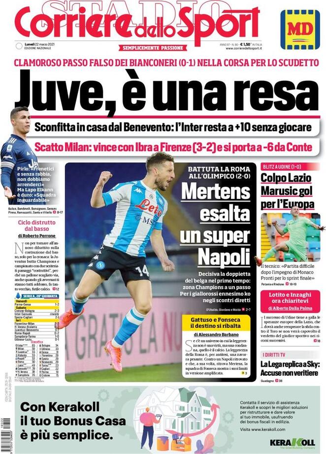 Nell'edizione odierna il Corriere dello Sport dedica il titolo centrale, in prima pagina, alla vittoria del Napoli contro la Roma: "Mertens esalta un super Napoli. Decisiva la doppietta del belga nel primo tempo. Zona Chamnpions a un passo. Per i giallorossi ennesimo ko negli scontri diretti". In alto spazio all'incredibile sconifita casalinga della Juventus contro il Benevento: "Juve, è una resa".