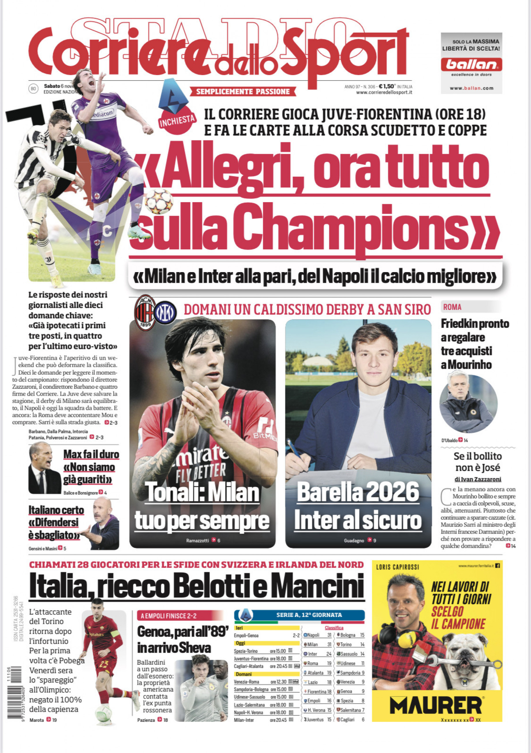 Il Corriere dello Sport nella prima pagina dell'edizione di oggi fa le carte alla corsa scudetto e alle coppe: "Allegri, ora tutto sulla Champions. Milan e Inter alla pari, del Napoli il calcio migliore". A centro pagina fari puntati sul centrocampo oggi e di domani di Milan e Inter, che domani si sfideranno nel derby: "Tonali, Milan per sempre. Barella 2026, Inter al sicuro". In taglio basso spazio ai convocati della Nazionale per le qualificazioni a Qatar 2022: "Italia, riecco Belotti e Mancini".