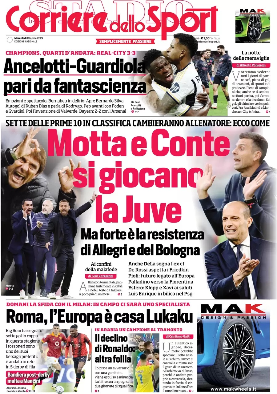 Nell'edizione di oggi, il Corriere dello Sport apre in prima pagina con il mercato degli allenatori: "Motta e Conte si giocano la Juve. Ma è forte la resistenza di Allegri e del Bologna". In taglio alto il pirotecnico 3-3 tra Real Madrid e Manchester City: "Ancelotti-Guardiola: pari da fantascienza". In taglio basso spazio alla Roma, che sfiderà giovedì il Milan nei quarti di Europa League: "Roma, l'Europa è casa Lukaku".