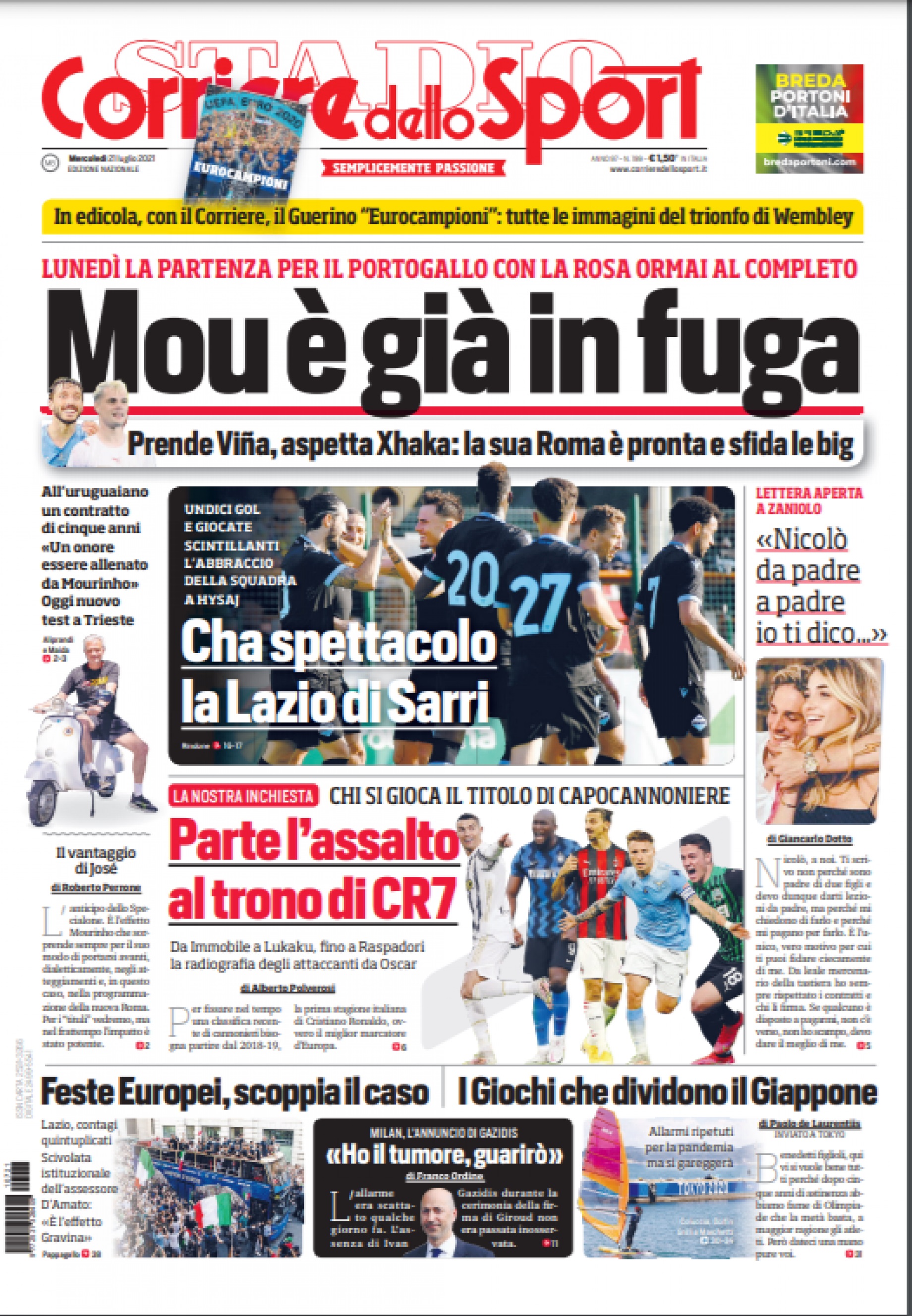 "Mou è già in fuga", apre così in prima pagina il Corriere dello Sport, nell'edizione di oggi. "Prende Viña, aspetta Xhaka: la sua Roma è pronta e sfida le big". A centro pagina spazio all'amichevole vinta 11-0 dalla Lazio: "Che spettacolo la Lazio di Sarri". In taglio basso l'inchiesta sul prossimo capocannoniere di Serie A: "Parte l'assalto al trono di CR7".