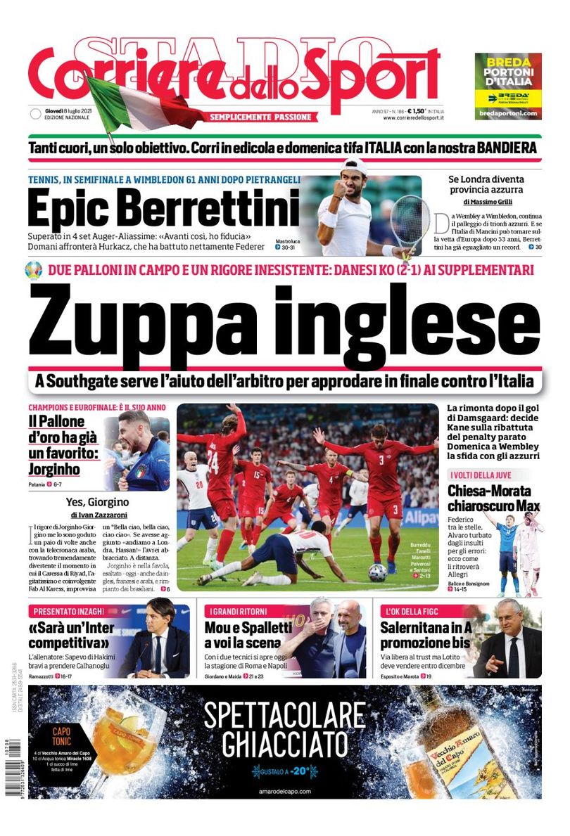 "Mou e Spalletti a voi la scena". Nell'edizione odierna, il Corriere dello Sport, titola così in prima pagina. "Con i due tecnici si apre oggi la stagione di Roma e Napoli". Apertura dedicata al vittoria dell'Inghilterra contro la Danimarca, tra le polemiche: "Zuppa inglese. A Southgate serve l'aiuto dell'arbitro per approdare in finale contro l'Italia". In taglio alto spazio all'impresa del tennis italiano a Wimbledon: "Epic Berettini".