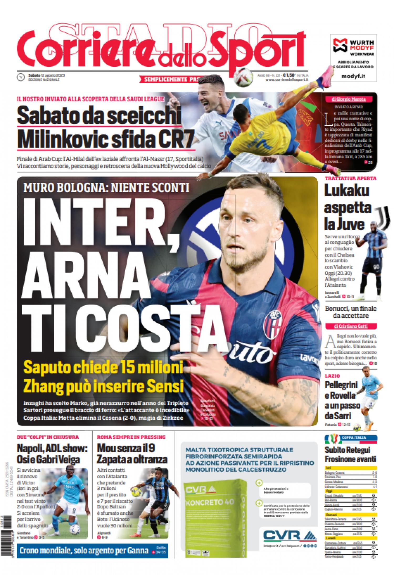 Nell'edizione di oggi, il Corriere dello Sport apre in prima pagina con il mercato: "Inter, Arnautovic ti costa 15". In taglio alto spazio alla finale di Arab Cup: "Sabato da sceicchi: Milinkovic sfida CR7". Nel box in basso il mercato del Napoli: "Napoli, ADL show: Osi e Gabri Veiga. Si avvicina il rinnovo di Victor (ieri in gol con Simeone nel test vinto 2-0 con l'Apollon). Si accelera per l'arrivo dello spagnolo".