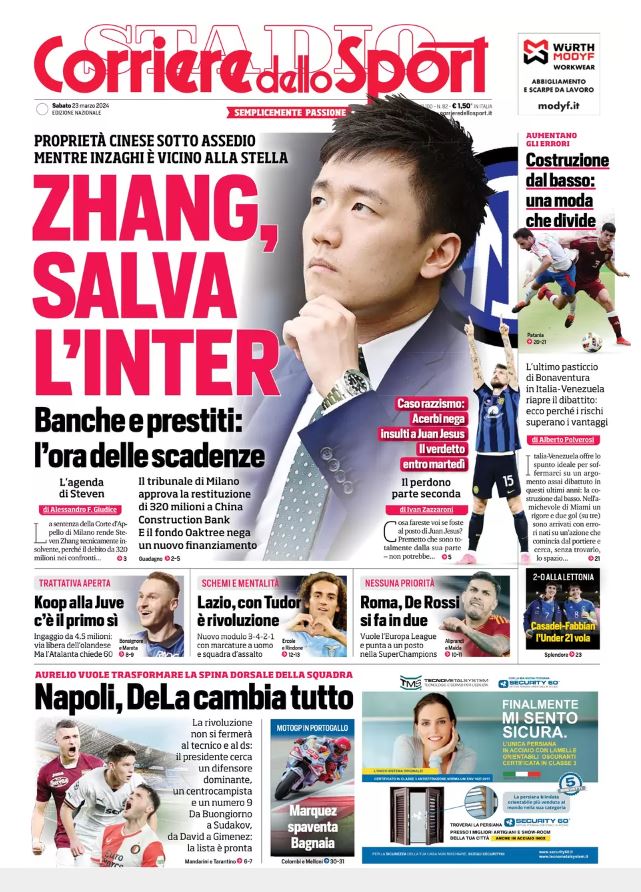 Nell'edizione odierna, Il Corriere dello Sport apre in prima pagina parlando della situazione degli azzurri: "Napoli, DeLa cambia tutto". Il sommario: "Aurelio vuole trasformare la spina dorsale della squadra". L'apertura al centro è riservata alle questioni societarie dei nerazzurri: "Zhang, salva l'Inter". Il commento in alto al box: "Proprietà cinese sotto assedio mentre Inzaghi è vicino alla stella". Spazio anche al caso Acerbi-Juan Jesus: "Caso razzismo: Acerbi nega insulti a Juan Jesus. Il verdetto entro martedì". In taglio basso, spazio al calciomercato: "Koop alla Juve: c'è il primo sì".