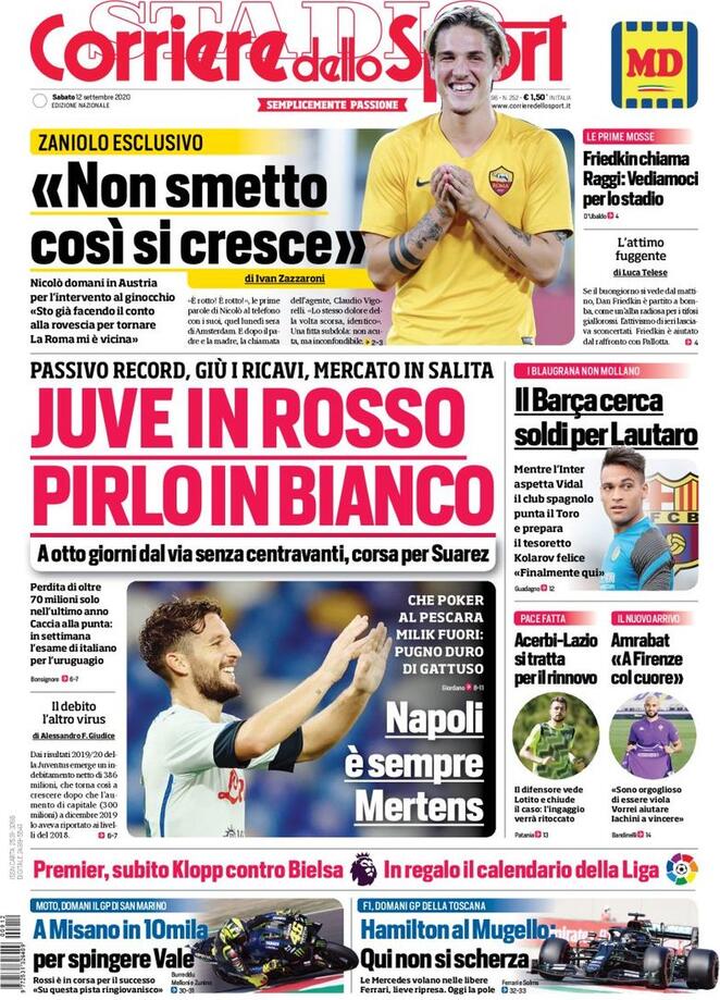Il Corriere dello Sport nella sua edizione di oggi titola a centro pagina: "Il Napoli è sempre Mertens". Spazio anche all'esclusione di Milik nell'amichevole contro il Pescara vinta dagli azzurri per 4-0: "Pugno duro di Gattuso". In alto invece si parla delle diifcoltà della Juventus a livello societario con le perdite in bilancio e il mercato in salita: "Juve in rosso, Pirlo in bianco".