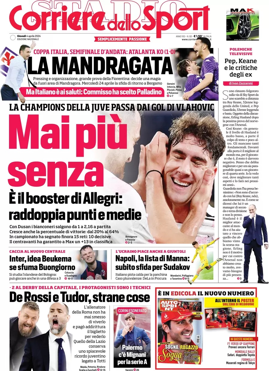 Nell'edizione di oggi, il Corriere dello Sport apre in prima pagina con la Juventus che si affida a Vlahovic per la lotta Champions: "Mai più senza". A centro pagina spazio ai possibili colpi di mercato del prossimo ds azzurro: "Napoli, la lista di Manna: subito sfida per Sudakov. L'ucraino piace anche a Giuntoli. Italiano pista calda per la panchina". Ancora a centro pagina il mercato della capolista: "Inter, idea Beukema se sfuma Buongiorno". In taglio basso spazio al derby della capitale: "De Rossi e Tudor, strane cose".