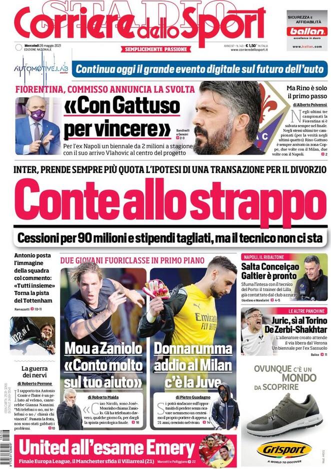 "Napoli, ribaltone: salta Conceição Galtier è pronto". Titola così in prima pagina il Corriere dello Sport nell'edizione di oggi. A centro pagina spazio al futuro di Antonio Conte: "Conte, allo strappo. Inter, prende sempre più quota una transazione per il divorzio". In alto spazio spazio alle dichiarazioni di Commisso sul nuovo tecnico viola: "Con Gattuso per vincere".