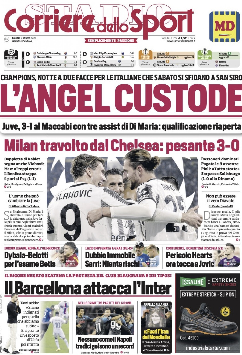 "Nessuno come il Napoli: tredici gol sono un record", titola così il Corriere dello Sport in prima pagina nell'edizione di oggi. Nessun'altra squadra ha segnato così tanto nelle prime tre partite del girone di Champions League. In apertura la vittoria della Juventus in Champions contro il Maccabi grazie ai tre assist di Angel Di Maria: "L'Angel custode". A centro pagina spazio al Milan sconfitto nettamente a Londra: "Milan travolto dal Chelsea: pesante 3-0".