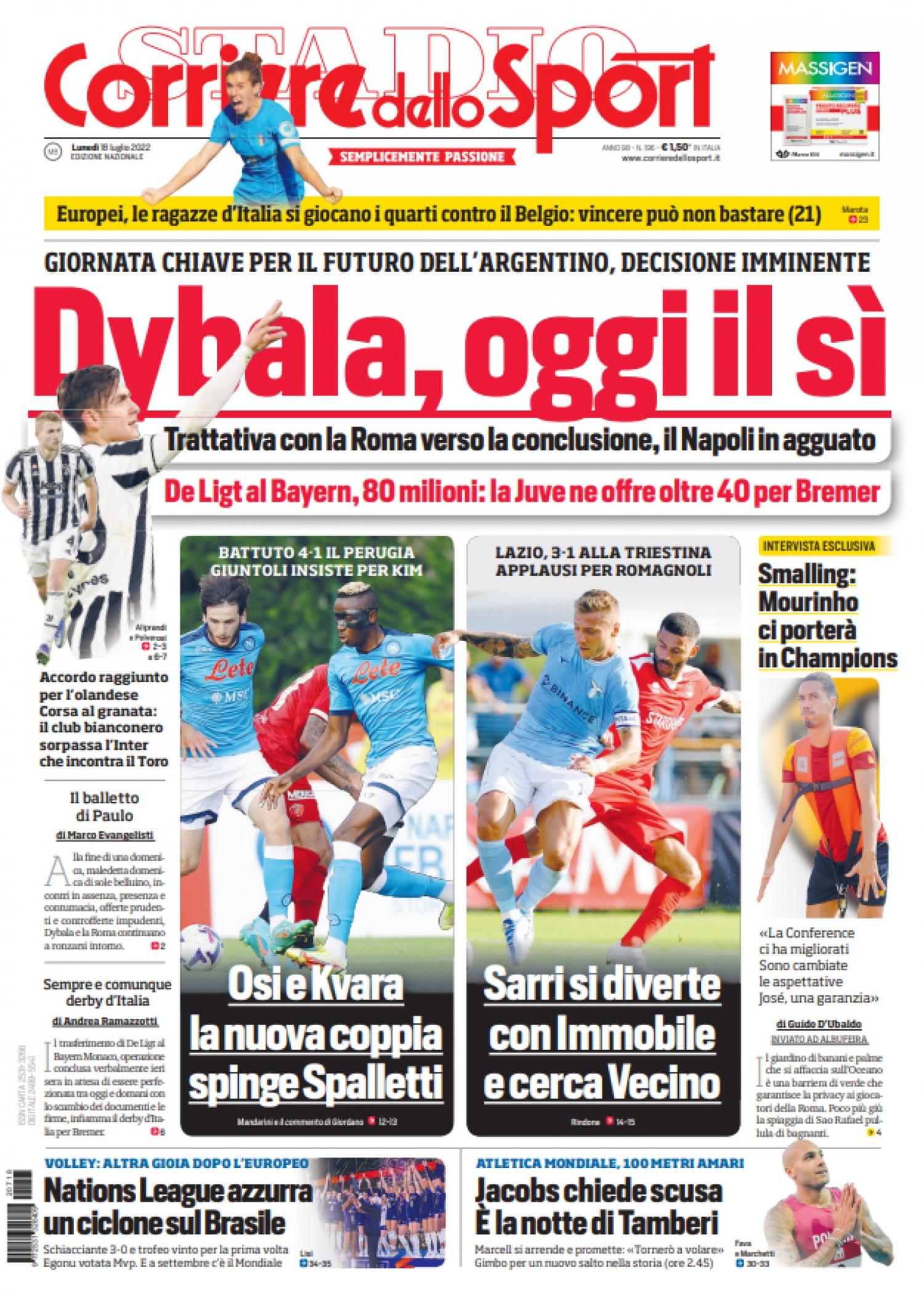"Osi e Kvara, la nuova coppia spinge Spalletti", titola così in prima pagina il Corriere dello Sport nell'edizione di oggi. "Battuto 4-1 il Perugia. Giuntoli insiste per Kim". Apertura dedicata a Dybala, che sembra essere sempre più vicino alla Roma: "Dybala, oggi il sì". A centro pagina spazio la mercato: "De Ligt al Bayern, 80 milioni: la Juve ne offre oltre 40 per Bremer".