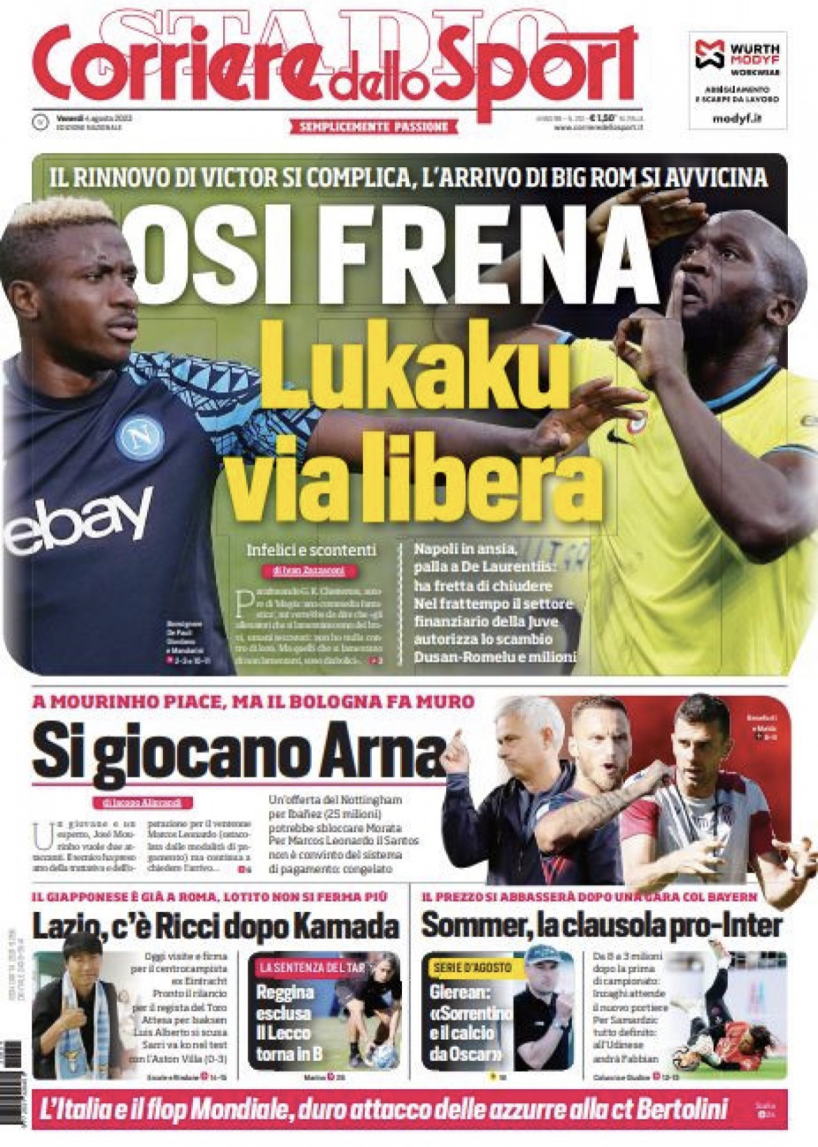 “Osi frena. Il rinnovo di Victor si complica”. Titola così al centro l’edizione odierna del Corriere dello Sport: "Napoli in ansia, palla a De Laurentiis che ha fretta di chiudere". Spazio anche alla Juventus: "L'arrivo di Big Rom si avvicina". In taglio basso la Lazio: "C'è Ricci dopo Kamada". Si parla anche dell'Inter: "Sommer, la clausola pro-Inter".