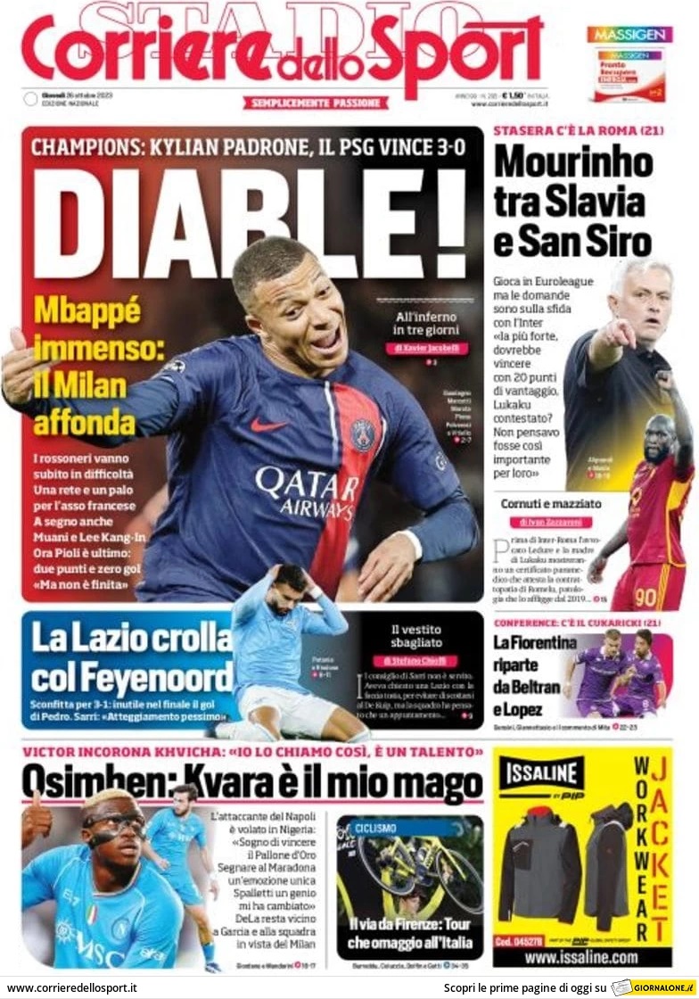 Nell'edizione di oggi, il Corriere dello Sport apre in prima pagina con la sconfitta del Milan a Parigi: "Diable! Mbappé immenso: il Milan affonda". In taglio basso spazio alla parole di Osimhen a Tv Play: "Kvara è il mio mago. Victor incorona Khvicha: 'Io lo chiamo così, è un talento'". Di spalla spazio alla Roma : "Mourinho tra Slavia e San Siro".