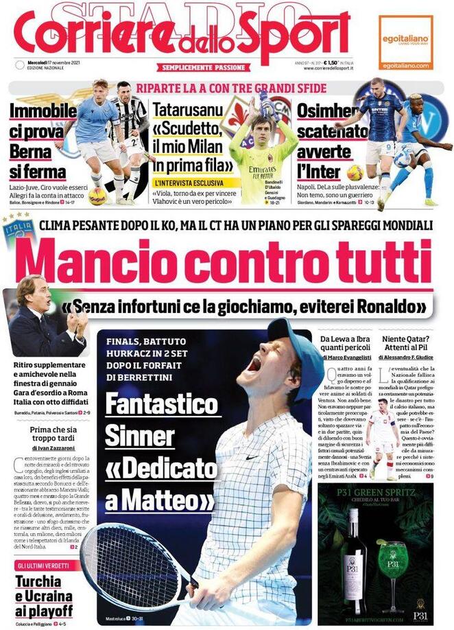 "Osimhen scatenato avverte l'Inter", titola così in prima pagina il Corriere dello Sport, nell'edizione di oggi. ADL sulle plusvalenze: "Non temo, sono un guerriero". Apertura dedicata al clima pesante introno alla Nazionale italiana dopo il flop con l'Irlanda del Nord: "Mancio contro tutti". In taglio alto spazio a Lazio-Juve con la situazione infortuni: "Immobile ci prova, Berna si ferma".