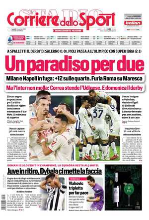 Nell'edizione di oggi, il Corriere dello Sport apre in prima pagina con le vittorie di Napoli e Milan che continuano sensa sosta la loro marcia da capliste: "Un paradiso per due. Milan e Napoli in fuga: +12 sulle quarte. Furia Roma su Maresca". A centro pagina spazio anche all'Inter che vince e vede invariato il suo distacco dalle prime: "Ma l'Inter non molla: Correa stende l'Udinese. E domenica il derby". Di spalla l'editoriale del direttore Ivan Zazzaroni sugli arbitri: "Non si capisce più una mazza”.