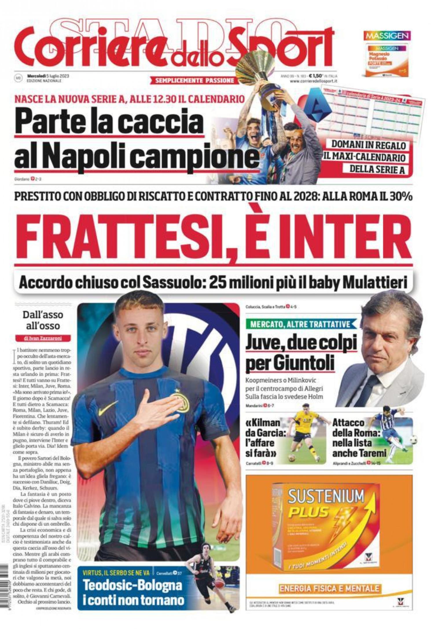 "Frattesi, è Inter", apre in prima pagina con l'accordo col Sassuolo per il centrocampista il Corriere dello Sport, nell'edizione di oggi. In taglio alto spazio al sorteggio del calendario della Serie A, in programma il 5 luglio alle 12:30: "Parte la caccia al Napoli campione". Di spalla il calciomercato: "Kilman da Garcia, l'affare si farà". "Juve, due colpi per Giuntoli". "Attacco della Roma: nella lista anche Taremi".