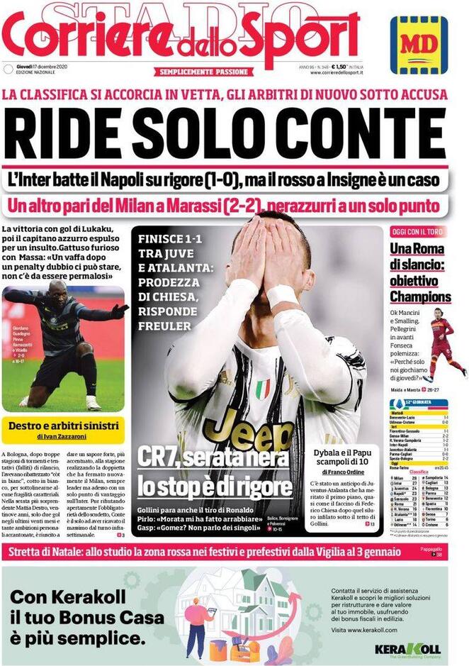 "CR7, serata nera. Lo stop è di rigore" scrive il Corriere dello Sport in apertura quest'oggi dando risalto al pareggio della Juventus contro l'Atalanta e anche al rigore fallito da Cristiano Ronaldo contro la Dea sull'1-1, primo rigore parato in A da Gollini. Prodezza di Chiesa in avvio, poi il pari di Freuler. Pirlo: "Morata mi ha fatto arrabbiare". Gasp: "Gomez? Non parlo dei singoli".
