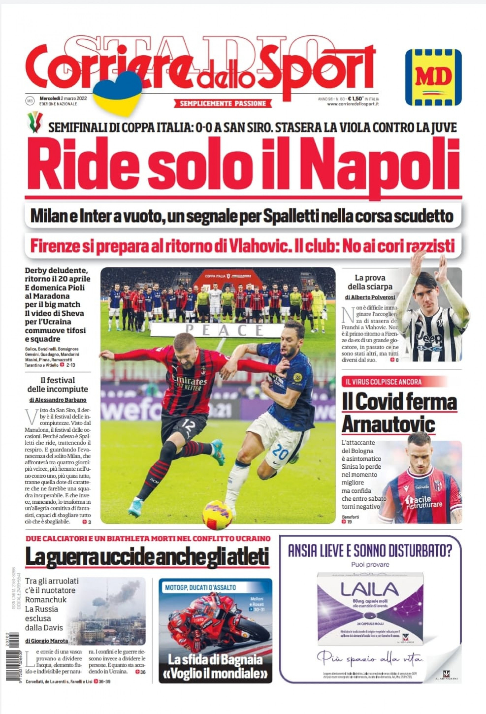 Nell'edizione di oggi il Corriere dello Sport apre in prima pagina con il derby di Milano in Coppa Italia: "Ride solo il Napoli. Milan e Inter a vuoto, un segnale per Spalletti nella corsa scudetto". Più in basso spazio all'altra semifinale di Coppa Italia tra Fiorentina e Juventus: "Firenze si prepara al ritorno di Vlahovic. Il club: No ai cori nazisti". In taglio basso spazio alle morti nello sport nel conflitto ucraino: "La guerra uccide anche gli atleti".