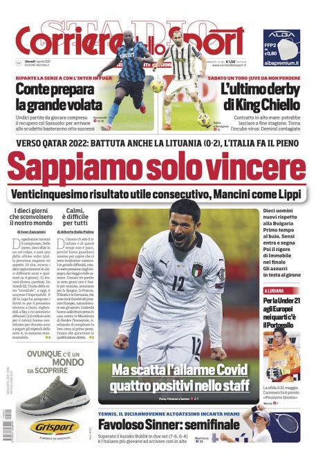 Nell'edizione odierna, il Corriere dello Sport apre in prima pagina con la terza vittoria consecutiva dell'Italia nelle qualificazioni ai Mondiali in Qatar del 2022: "Sappiamo solo vincere. Venticinquesimo risultato utile consecutivo, Mancini come Lippi. Ma scatta l'allarme Covid: quattro positivi nello staff". In alto spazio alla lotta per lo scudetto: "Conte prepara la grande volata".