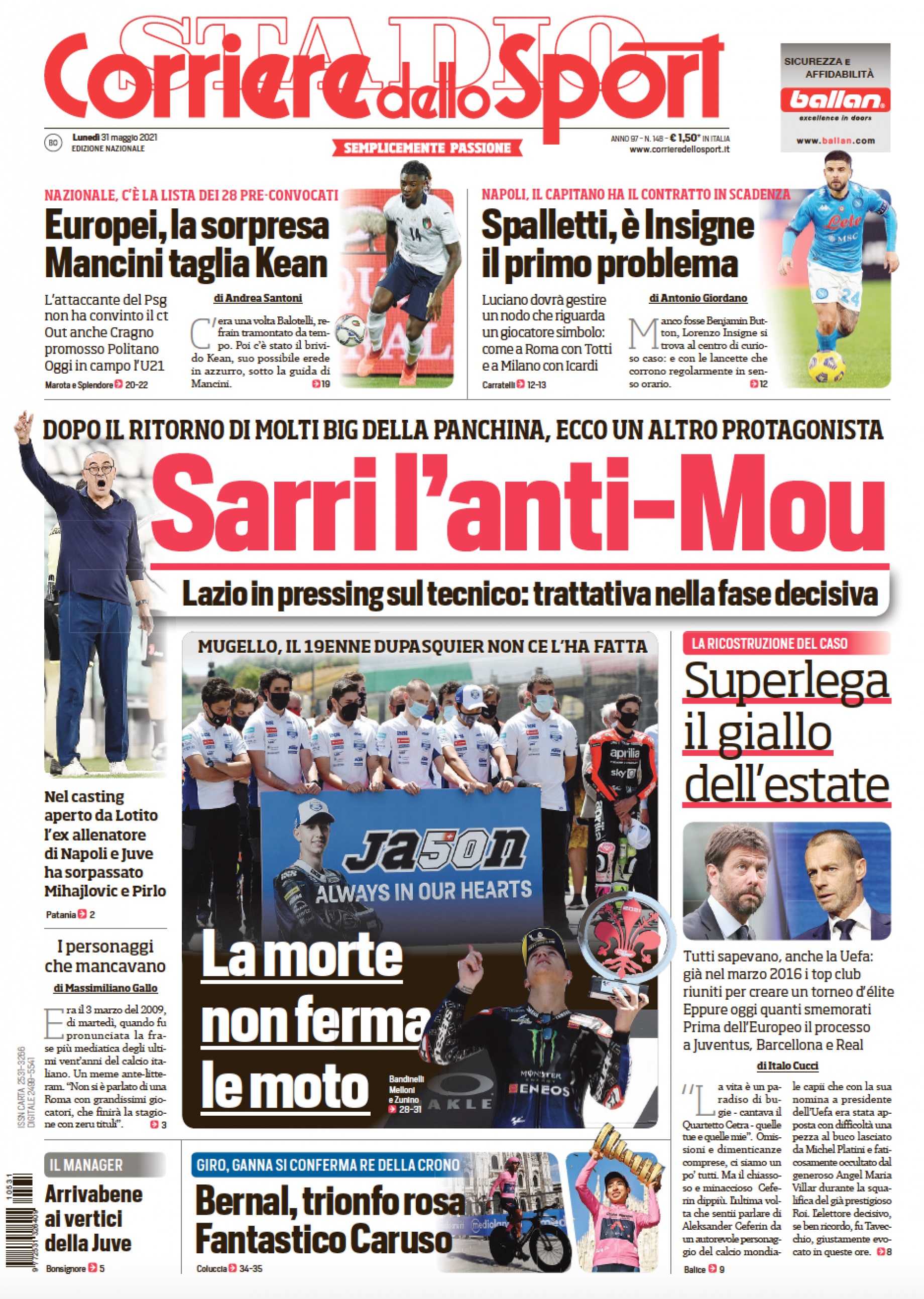 "Sarri l'anti Mou". Titola così in prima pagina il Corriere dello Sport nell'edizione odierna. "Lazio in pressing sul tecnico: trattativa nella fase decisiva". In taglio alto spazio al Napoli alle prese con il contratto di Insigne in scadenza: "Spalletti, è Insigne il primo problema". Sempre in alto spazio alle convocazioni del ct della Nazionale Mancini: "Europei, la sorpresa Mancini taglia Kean".