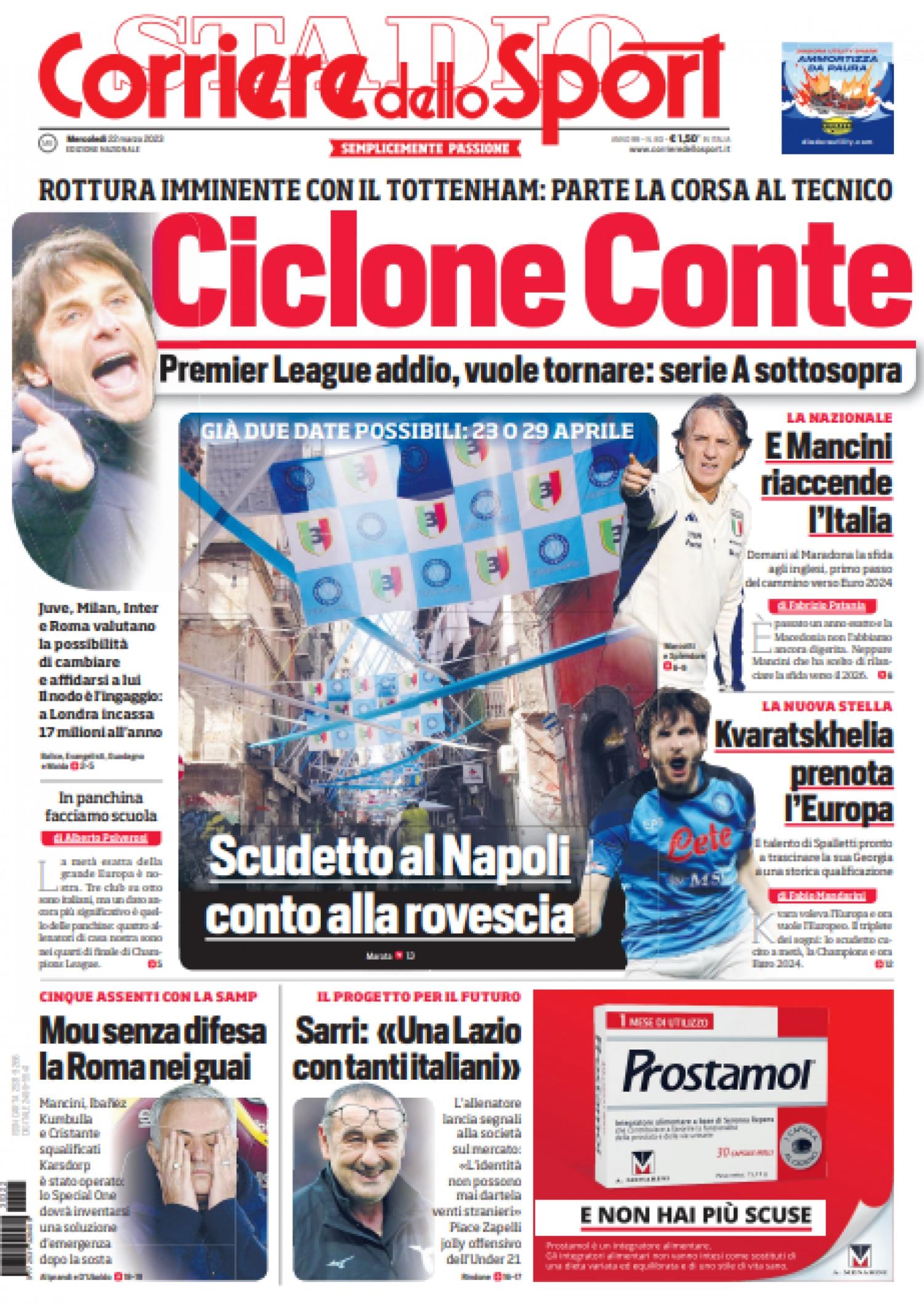 Nell'edizione di oggi, il Corriere dello Sport apre in prima pagina con la situazione di Conte al Tottenham: "Ciclone Conte". Nel taglio centrale anche il conto alla rovescia per lo scudetto del Napoli: "Scudetto al Napoli, conto alla rovescia. Già due date possibili: 23 o 29 aprile". Di spalla spazio a Kvara: "Kvaratskhelia prenota l'Europa". Ancora di spalla la Nazionale: "E Mancini riaccende l'Italia".