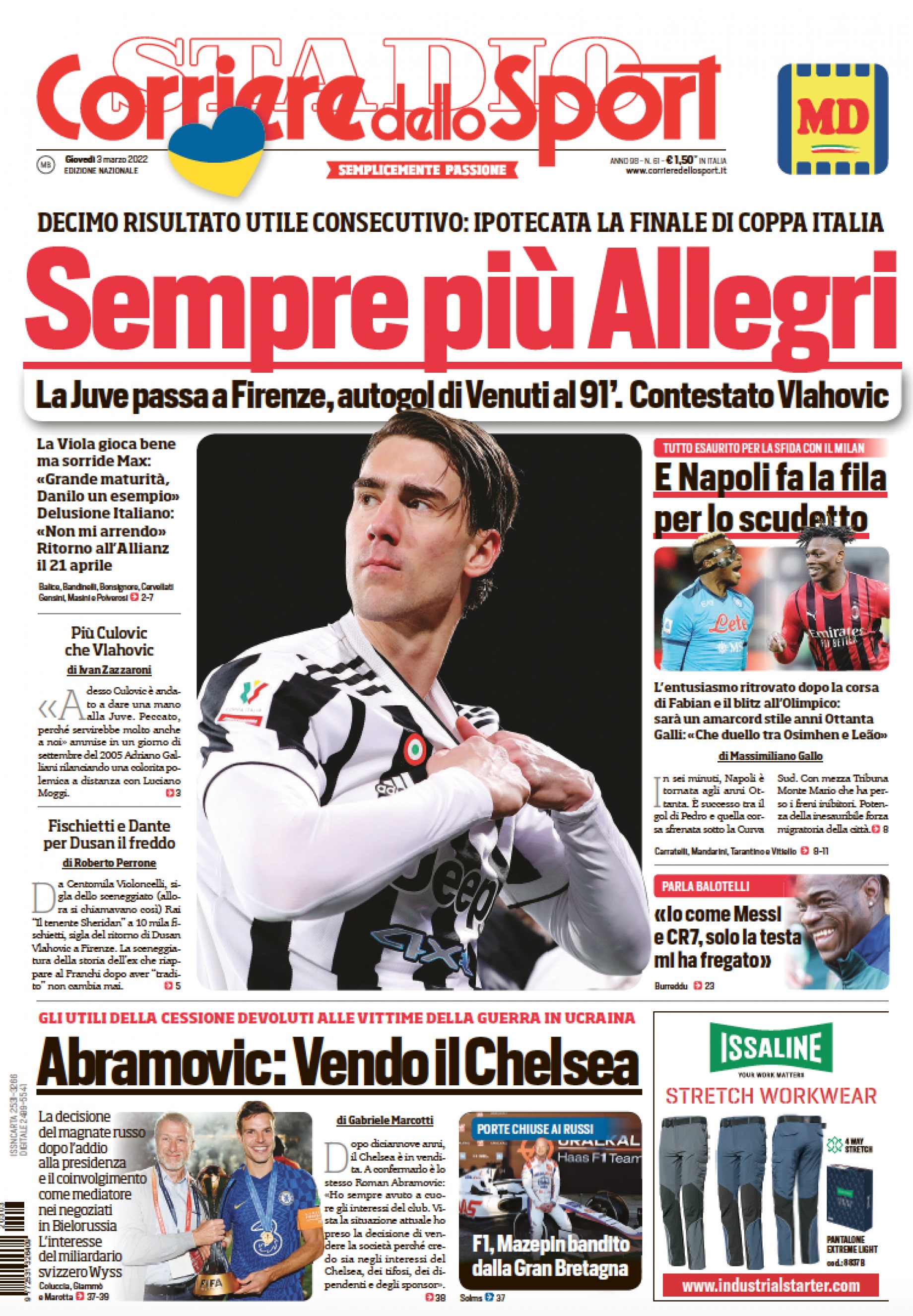Nell'edizione di oggi il Corriere dello Sport apre in prima pagina con la vittoria della Juventus contro la Fiorentina nella semifinale d'andata di Coppa Italia: "Sempre più Allegri. La Juve passa a Firenze, autogol di Venuti al 91'. Contestato Vlahovic". Di spalla spazio alla sfida scudetto del Maradona: "Tutto esaurito per la sfida con il Milan. E il Napoli fa la fila per lo scudetto". In taglio basso la clamorosa decisione presa da Abramovic: "Vendo il Chelsea".