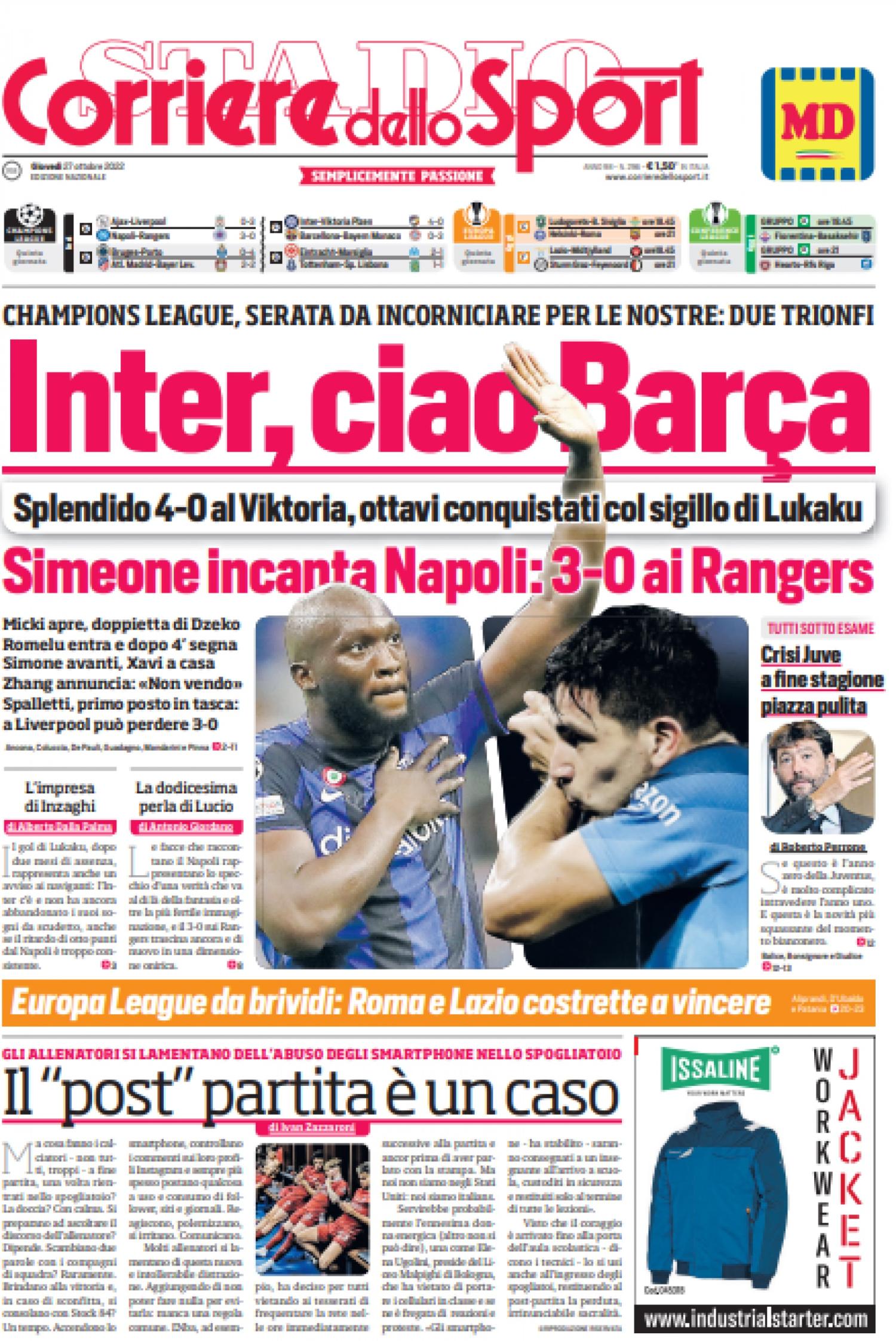 "Simeone incanta Napoli: 3-0 ai Rangers", titola così nell'edizione di oggi il Corriere dello Sport in prima pagina dopo la vittoria degli azzurri in Champions. "Spalletti, primo posto in tasca: a Liverpool può perdere 3-0". Apertura dedicata all'Inter che batte il Victoria Plzen e si qualifica agli ottavi di Champions: "Inter, ciao Barça". Di spalla spazio al periodo nero della Juventus: "Crisi Juve, a fine stagione piazza pulita".