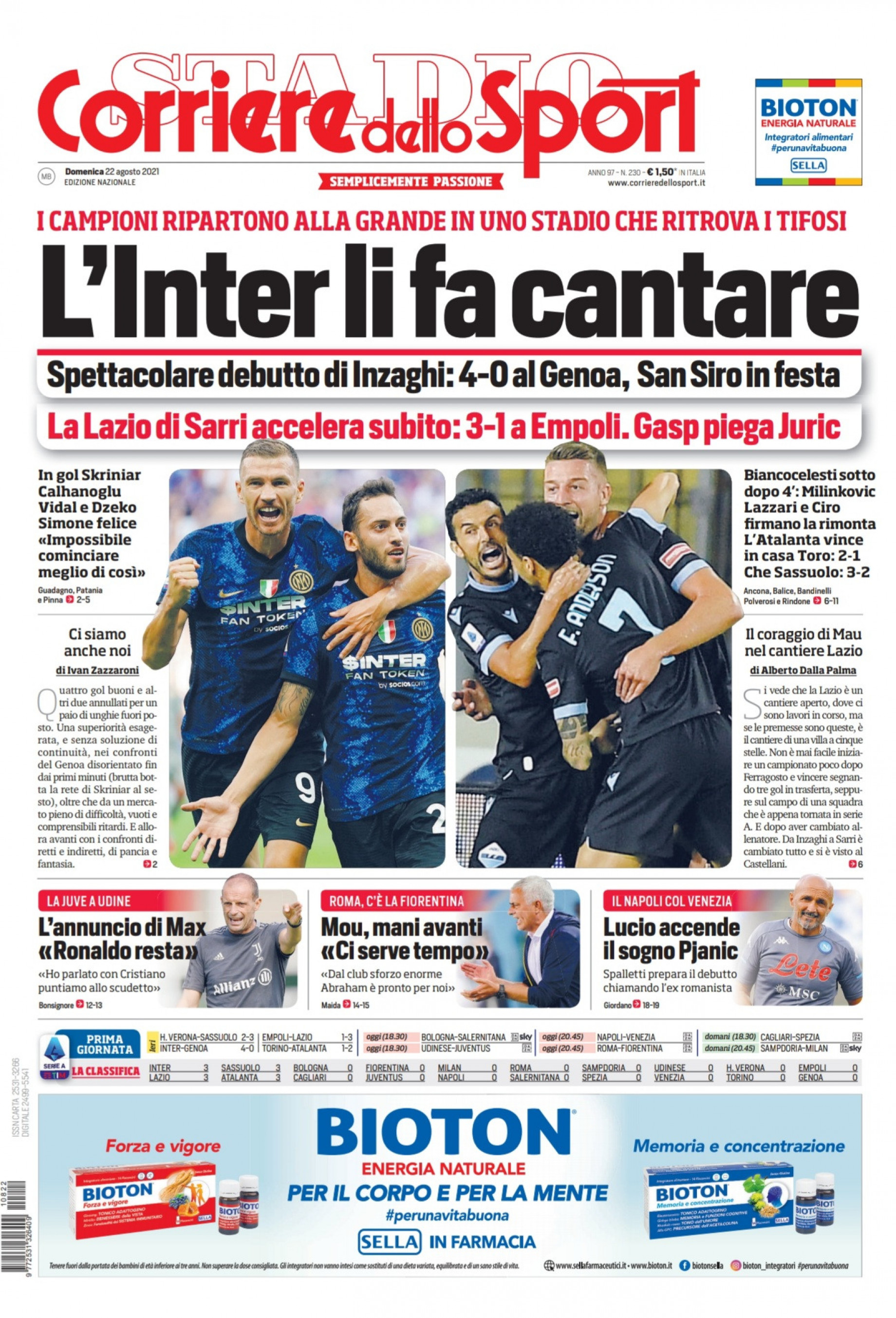 Nell'edizione di oggi il Corriere dello Sport lancia una bomba di mercato in prima pagina: "Lucio accende il sogno Pjanic. Spalletti prepara il debutto chiamando l'ex romanista". Apertura dedica al poker all'esordio dell'Inter di Simone Inzaghi: "L'Inter li fa cantare". In taglio basso spazio all'annuncio di Allegri in conferenza stampa: "Ronaldo resta".