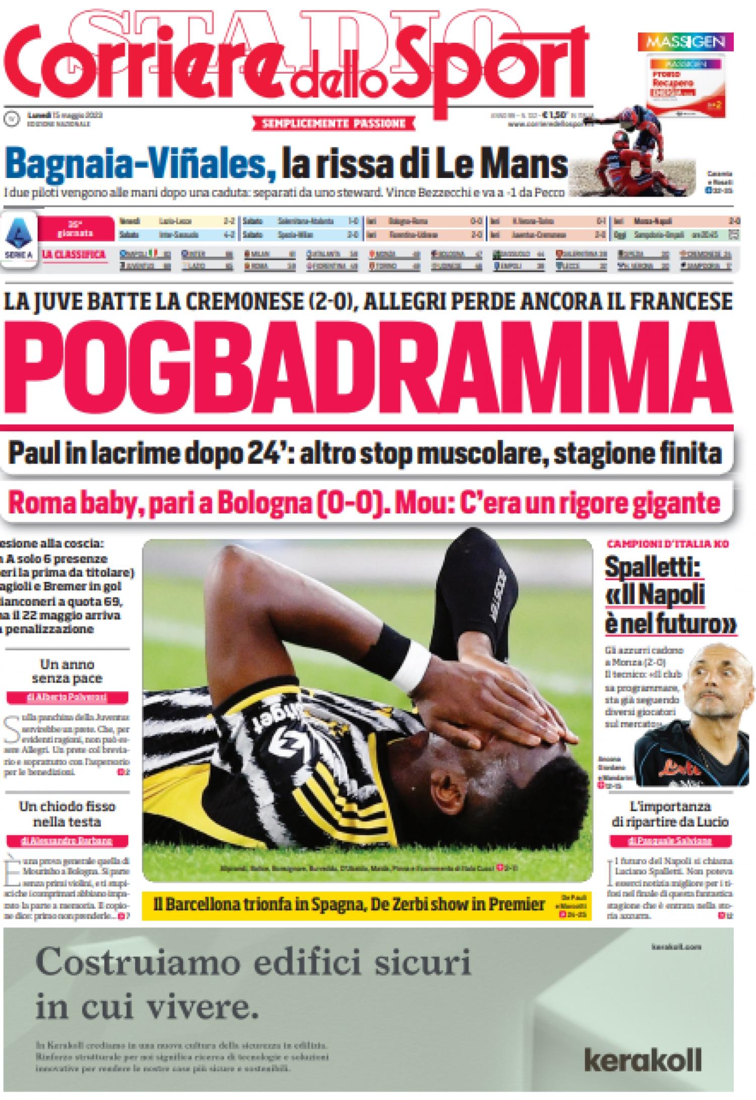 Nell'edizione odierna, il Corriere dello Sport apre in prima pagina con il nuovo infortunio di Pogba arrivato durante la partita contro la Cremonese: "Pogbadramma. Paul in lacrime dopo 24: altro stop muscolare, stagione finita". A centro pagina il pareggio della Roma: "Roma baby, pari a Bologna (0-0). Mou: C'era un rigore gigante". In colonna spazio anche per la sconfitta del Napoli: "Spalletti: 'Il Napoli è nel futuro'. Gli azzurri cadono a Monza (2-0). Il tecnico: 'Il club sa programmare, sta già seguendo diversi giocatori sul mercato'".