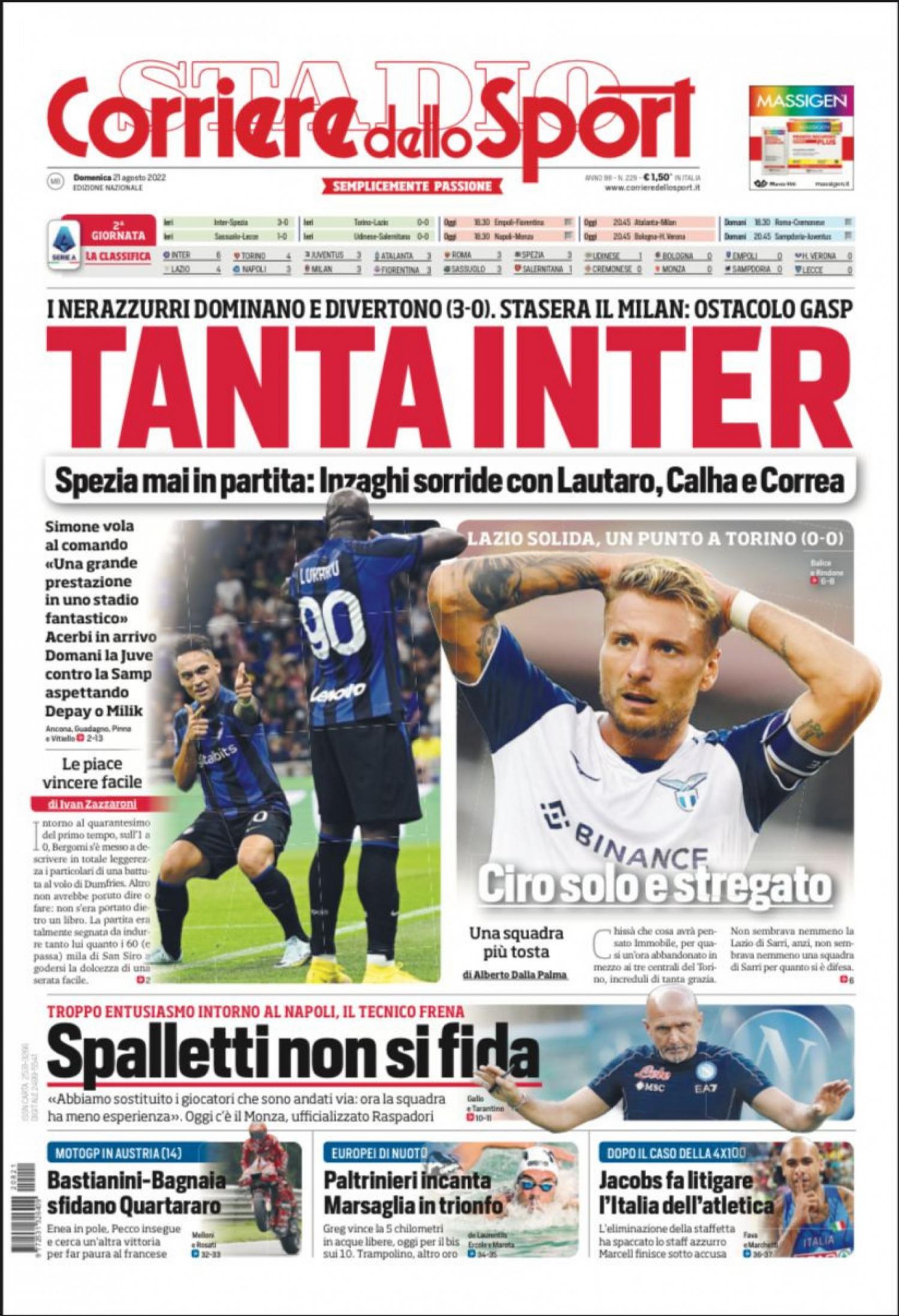Spalletti non si fida, titola in taglio basso l'edizione nazionale del Corriere dello Sport che mette in evidenza la frenata del tecnico al troppo entusiasmo intorno al Napoli: "Abbiamo sostituito i giocatori che sono andati via, ora la squadra ha meno esperienza".