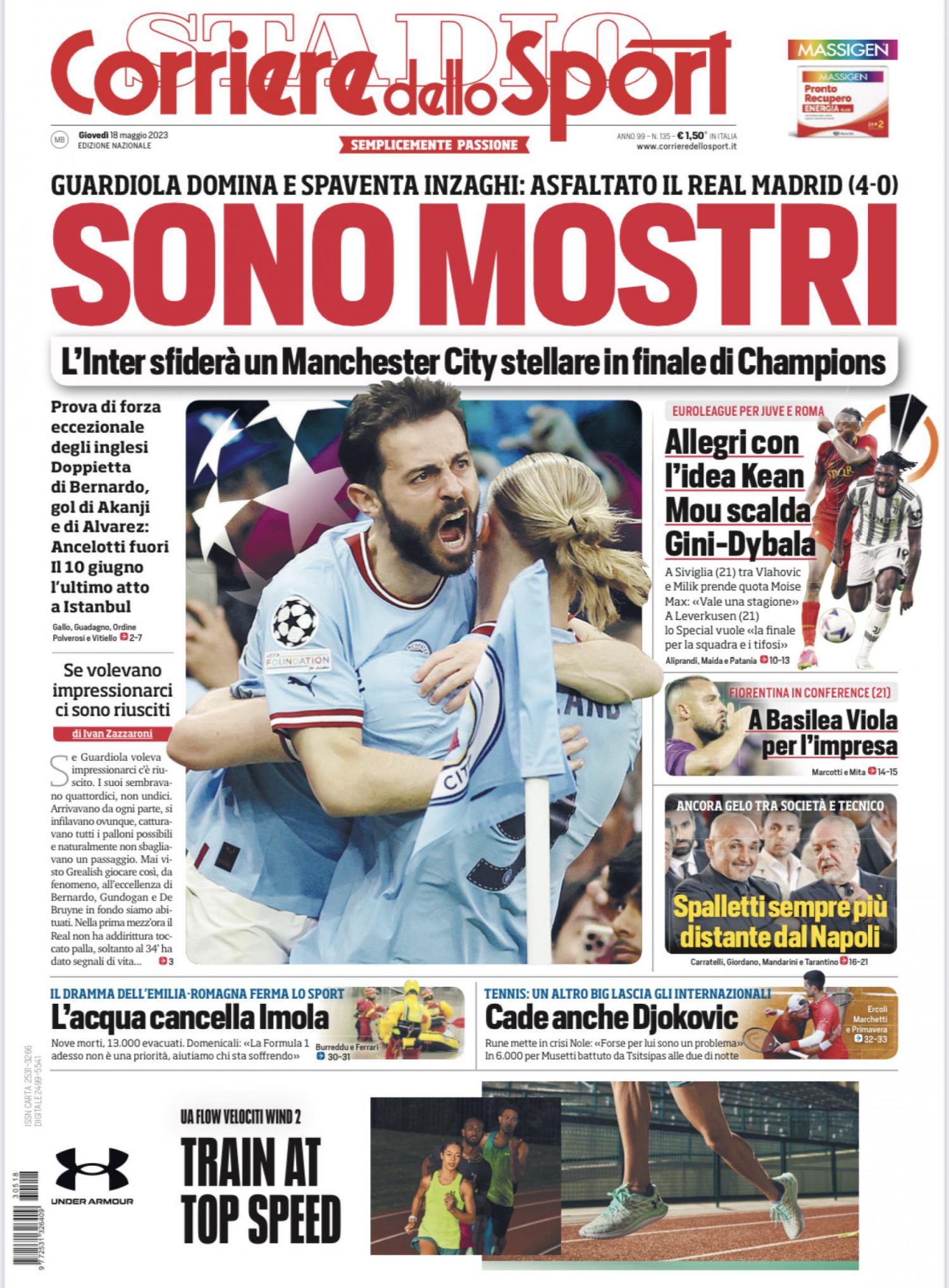 "Spalletti sempre più distante dal Napoli", titola così in taglio basso in prima pagina il Corriere dello Sport nell'edizione di oggi. "Ancora gelo tra società e tecnico". In apertura la semifinale di Champions dominata dal Manchester City: "Sono mostri". Di spalla spazio all'Europa League e alla Conference League: "Allegri con l'idea Kean, Mou scalda Gini-Dybala". "A Basilea viola per l'impresa".