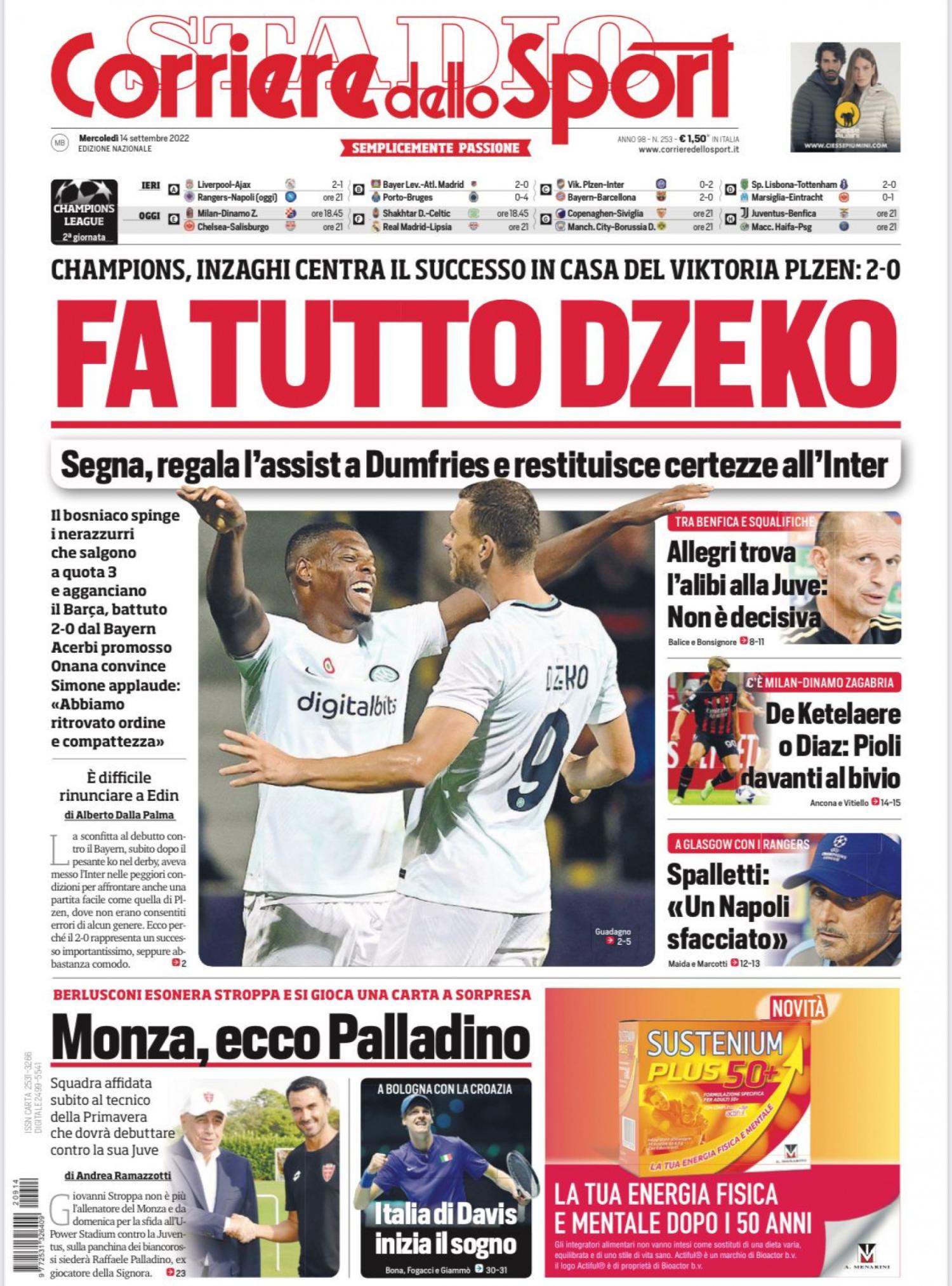 ”Spalletti: 'Un Napoli sfacciato'", il Corriere dello Sport riporta in prima pagina le dichiarazioni del tecnico azzurro in vista della sfida di oggi contro i Rangers in Champions League. In apertura il successo dell'Inter in Champions contro il Viktoria Plzen: "Fa tutto Dzeko". In taglio basso spazio all'esonero di Stroppa e al nuovo tecnico del club di Berlusconi: "Monza, ecco Palladino".
