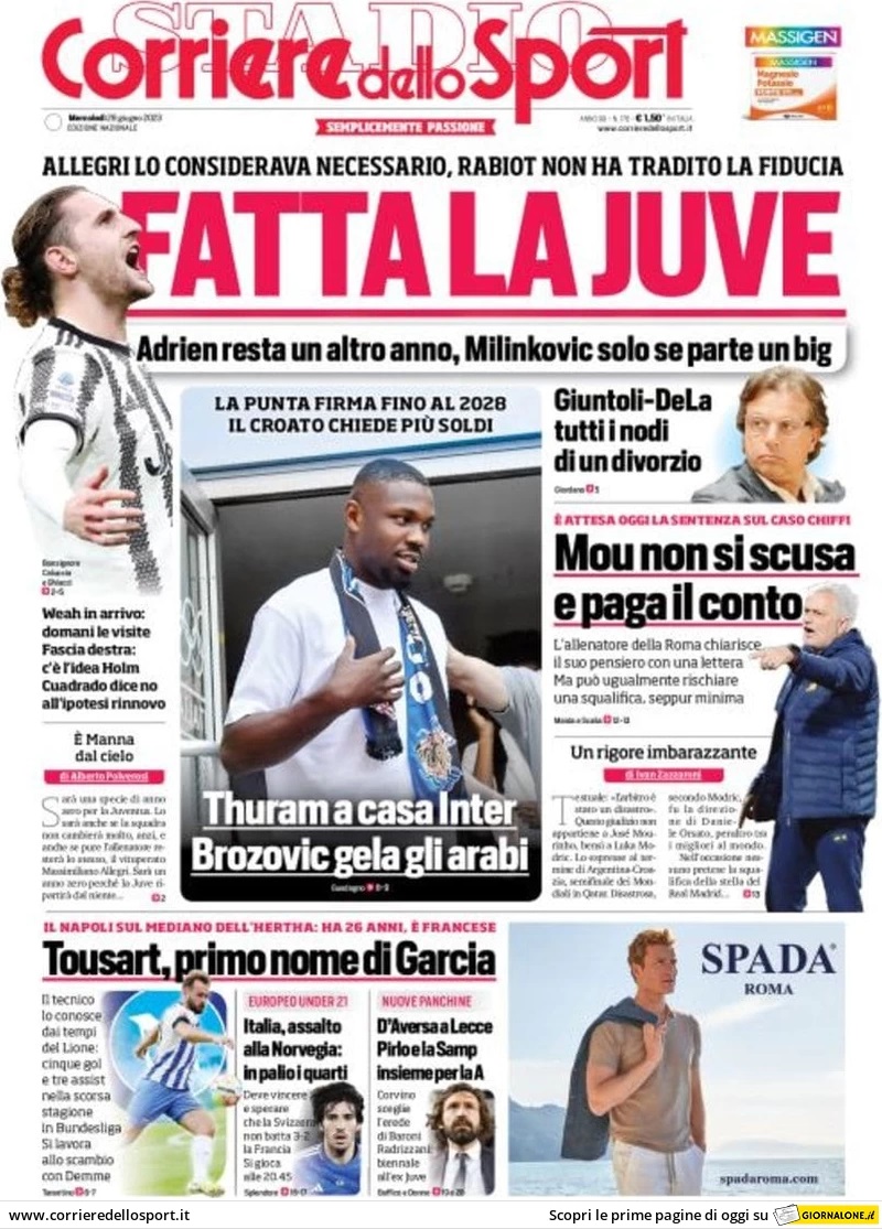 Nell'edizione di oggi, il Corriere dello Sport apre in prima pagina con il rinnovo di Rabiot: "Fatta la Juve". In taglio basso spazio al mercato del Napoli: "Tousart, primo nome di Garcia. Si lavora allo scambio con Demme". Ancora Napoli di spalla, con la questione Giuntoli: "Giuntoli-DeLa, tutti i nodi di un divorzio". A centro pagina spazio al mercato dell'Inter: "Thuram a casa Inter. Brozovic gela gli arabi".