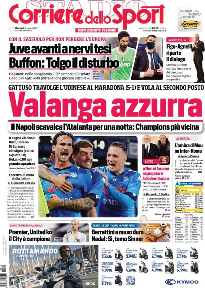 Nell'edizione odierna il Corriere dello Sport apre in prima pagina con la schiacciante vittoria del Napoli contro l'Udinese: "Valanga azzurra. Il Napoli scavalca l'Atalanta per una notte: Champions più vicina". In taglio alto spazio al momento delicato in casa bianconera: "Juve avanti a nervi tesi. Buffon: 'Tolgo il disturbo'". In taglio basso in evidenza la vittoria della Premiere della squadra di Guardiola: "United ko, il City è campione".