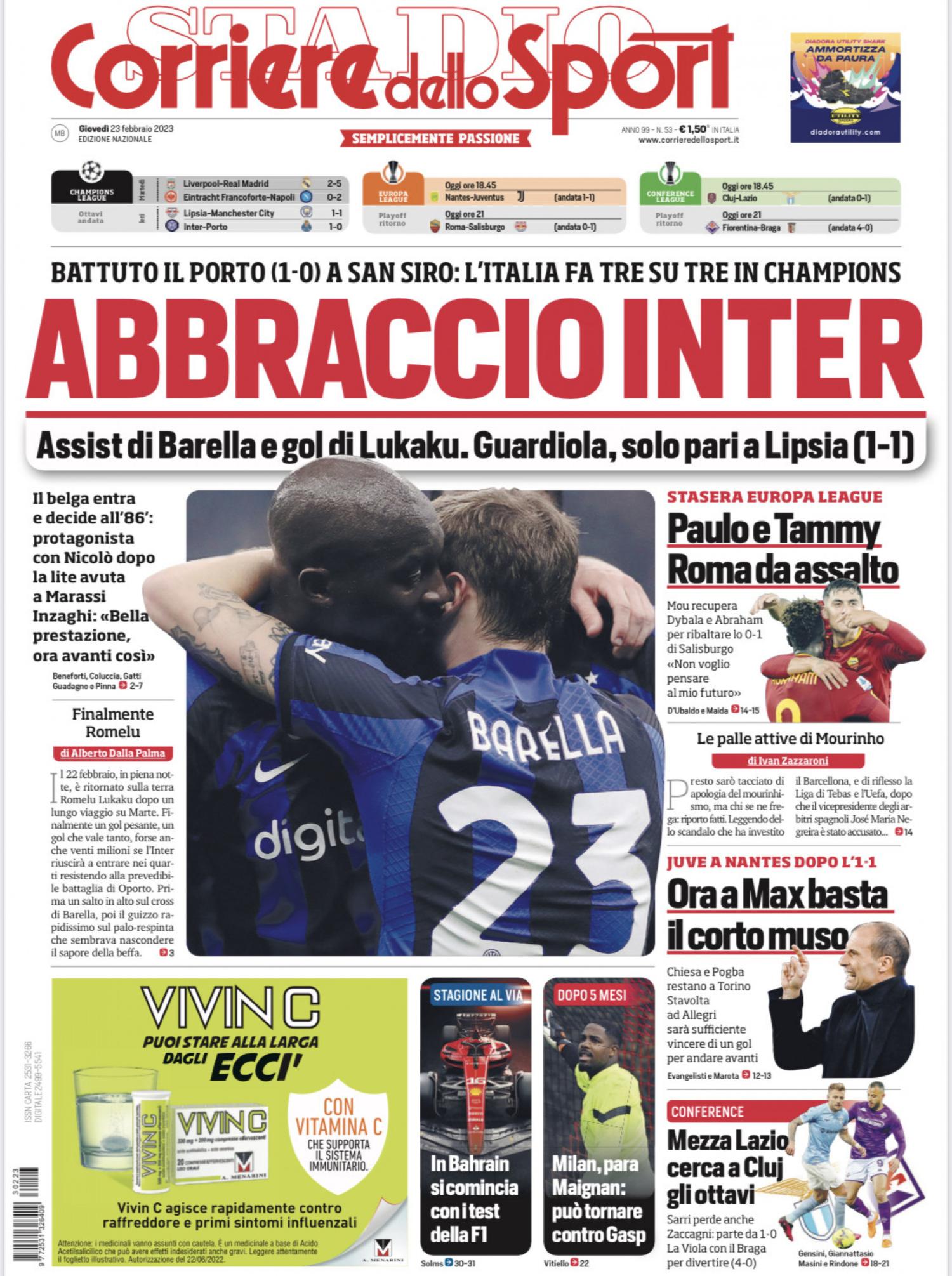 Nell'edizione di oggi, il Corriere dello Sport apre in prima pagina con la vittoria dell'Inter contro il Porto in Champions League: "Abbraccio Inter. Assist di Barella e gol di Lukaku". Di spalla spazio all'Europa League: "Paulo e Tammy, Roma d'assaolto", e "Ora Max basta il corto muso". In taglio basso la Conference League: "Mezza Lazio cerca a Cluj gli ottavi".