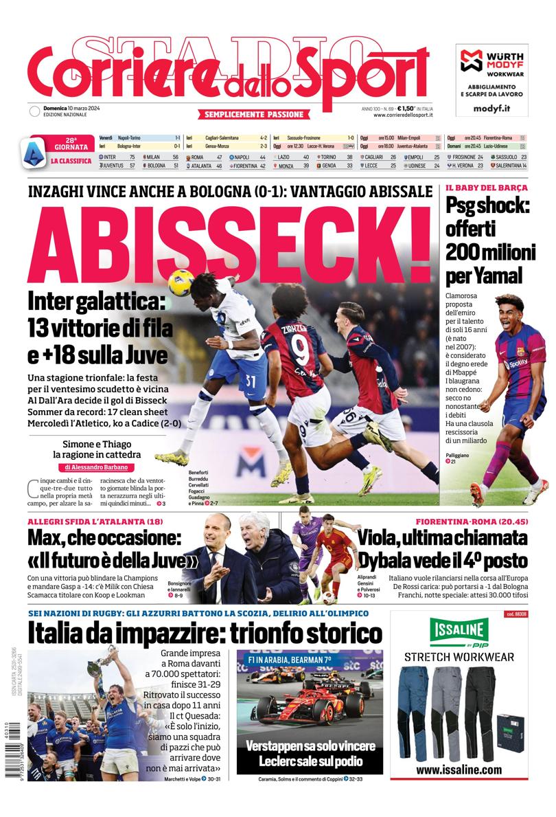 “ABisseck!”. Titola così al centro l’edizione odierna del Corriere dello Sport: "Inzaghi vince anche a Bologna: vantaggio abissale. Inter galattica: 13 vittorie di fila e +18 sulla Juve". Spazio anche a Juventus-Atalanta con le parole di Allegri e a Fiorentina-Roma: "Viola, ultima chiamata. Dybala vede il 4° posto".