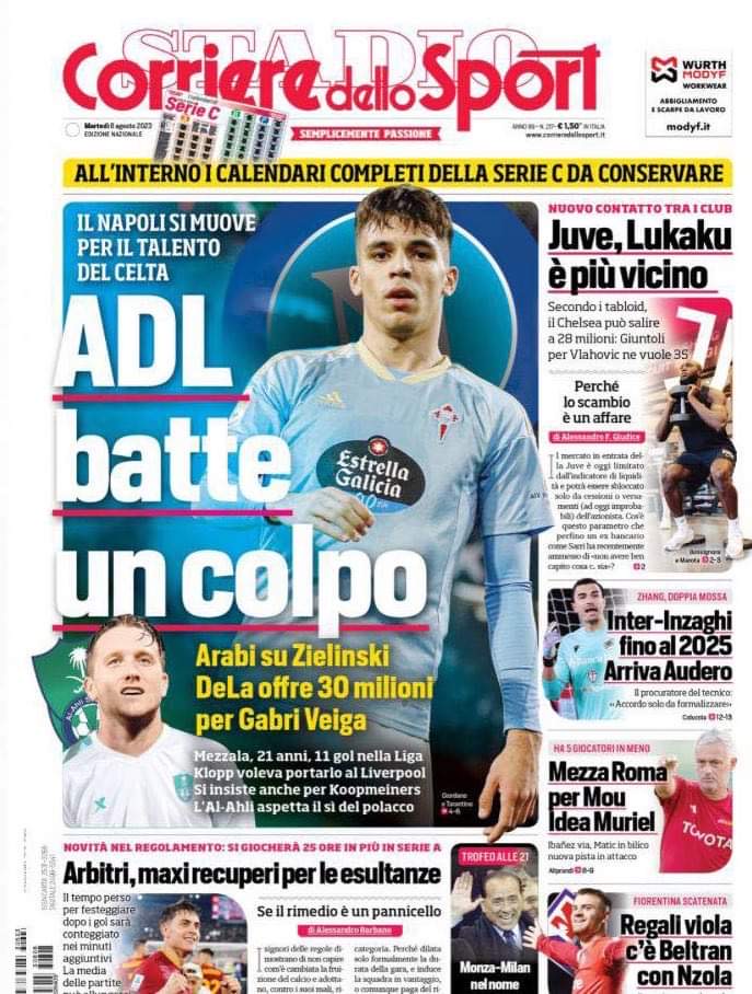 “ADL batte un colpo”. Titola così al centro l’edizione odierna del Corriere dello Sport: "Il Napoli si muove per il talento del Celta. Arabi su Zielinski. DeLa offre 30 milioni per Gabri Veiga. Mezzala, 21 anni, 11 gol nella Liga, Klopp voleva portarlo al Liverpool. Si insiste anche per Koopmeiners. L'Al Ahli aspetta il sì del polacco". Di spalla la Juve: "Lukaku è più vicino". Spazio anche all'Inter: "Inzaghi fino al 2025. Arriva Audero". Si parla di spalla anche della Roma: "Mezza Roma per Mou. Idea Montiel".
