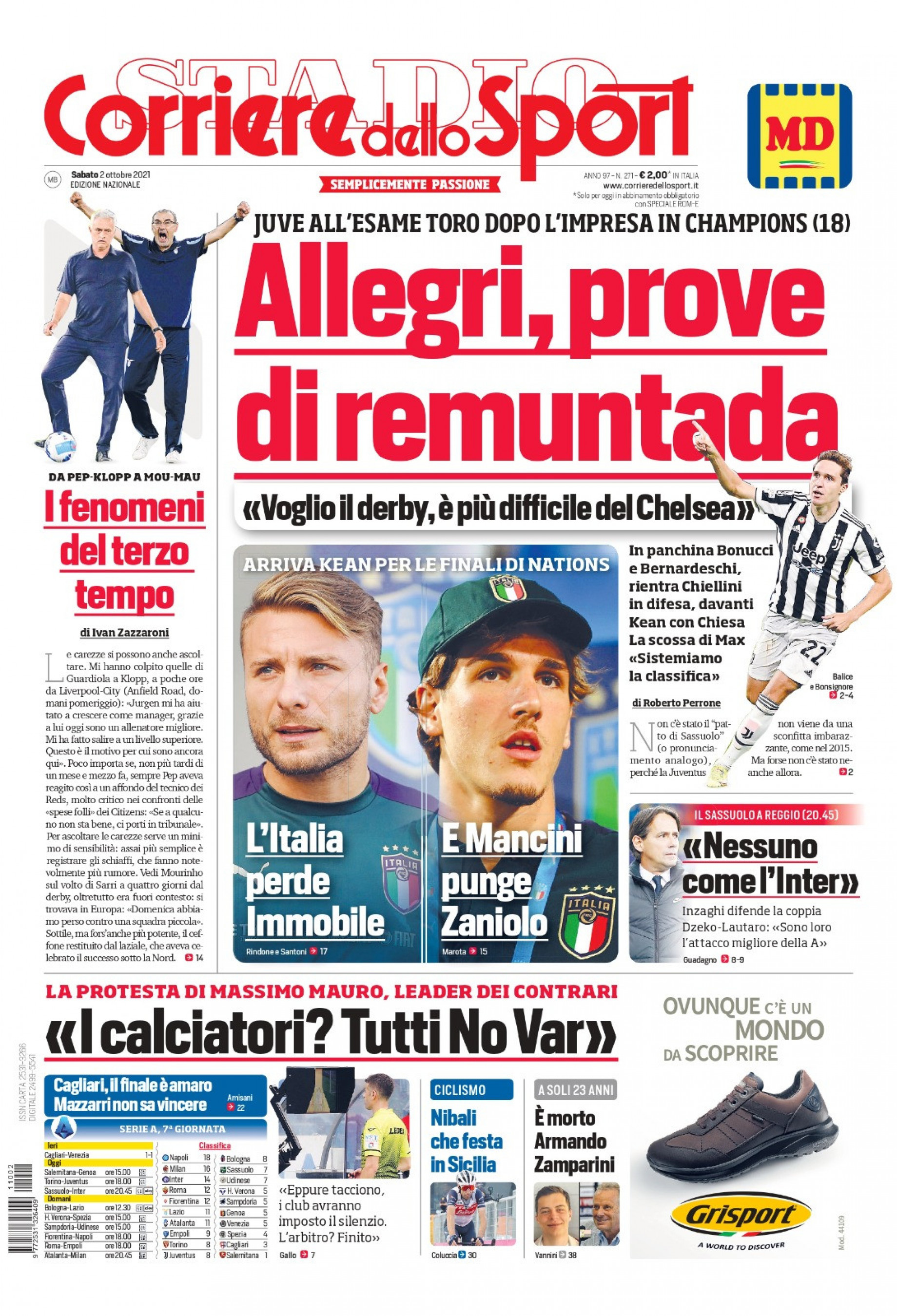 Il Corriere dello Sport apre in prima pagina con la Juventus: "Allegri, prove di remuntada. Juve all'esame Toro dopo l'impresa in Champions. 'Voglio il derby, è più difficile del Chelsea'". Al centro spazio anche alla Nazionale italiana: "L'Italia perde Immobile, e Mancini punge Zaniolo". In taglio basso il pareggio del Cagliari contro il Venezia.